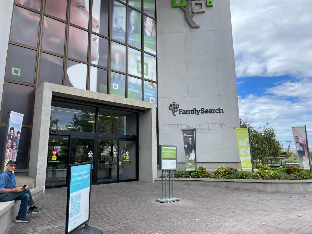 Right across the way is the Family History Library. Anyone can go in and research their ancestry for FREE. People visit here for days/weeks to study their ancestry because the records are so complete. Some of Steve’s relatives, married into his family, made contributions to the Library by dictating and recording the stones in small cemeteries in Oklahoma and other locations.