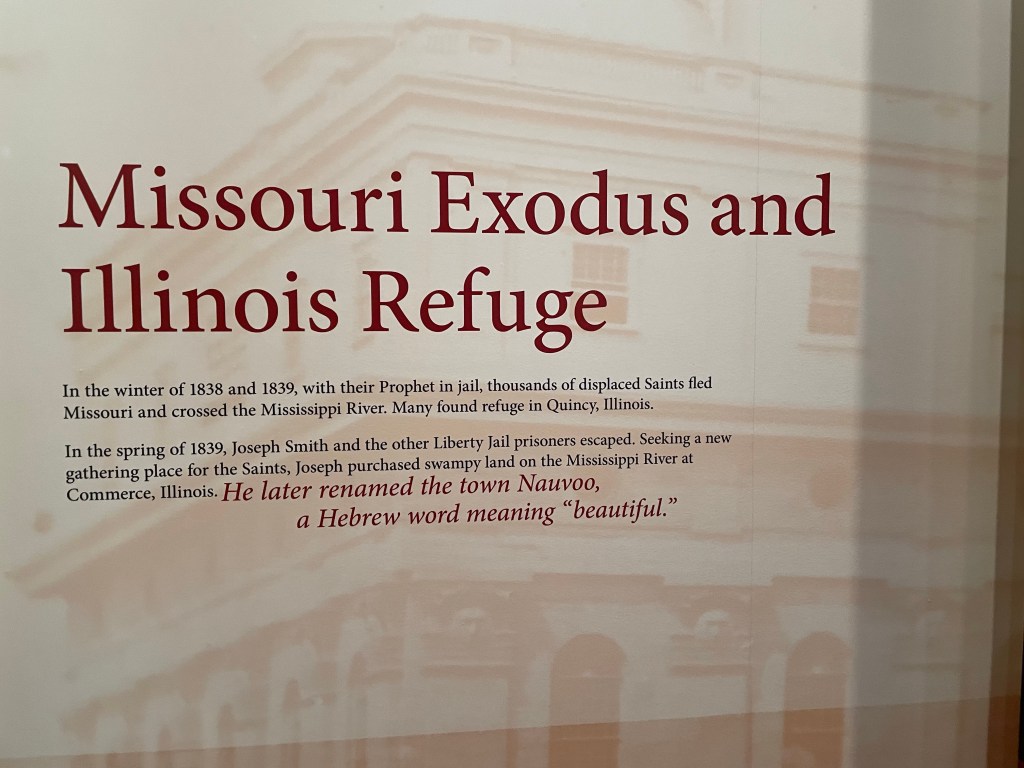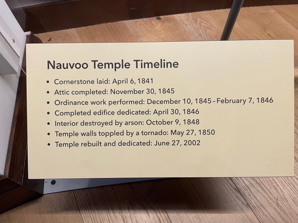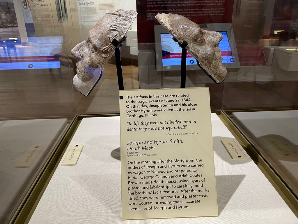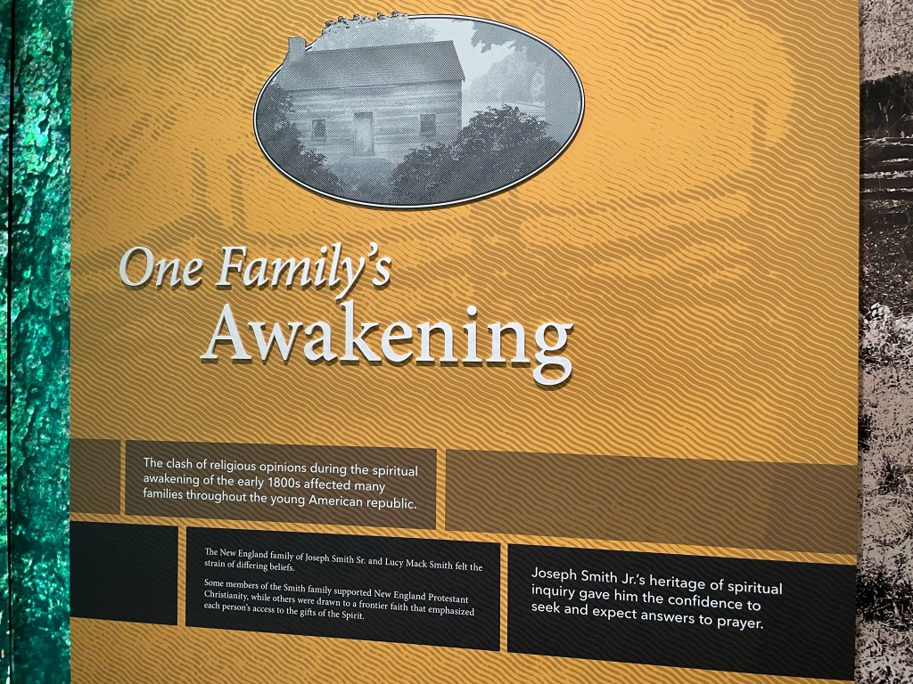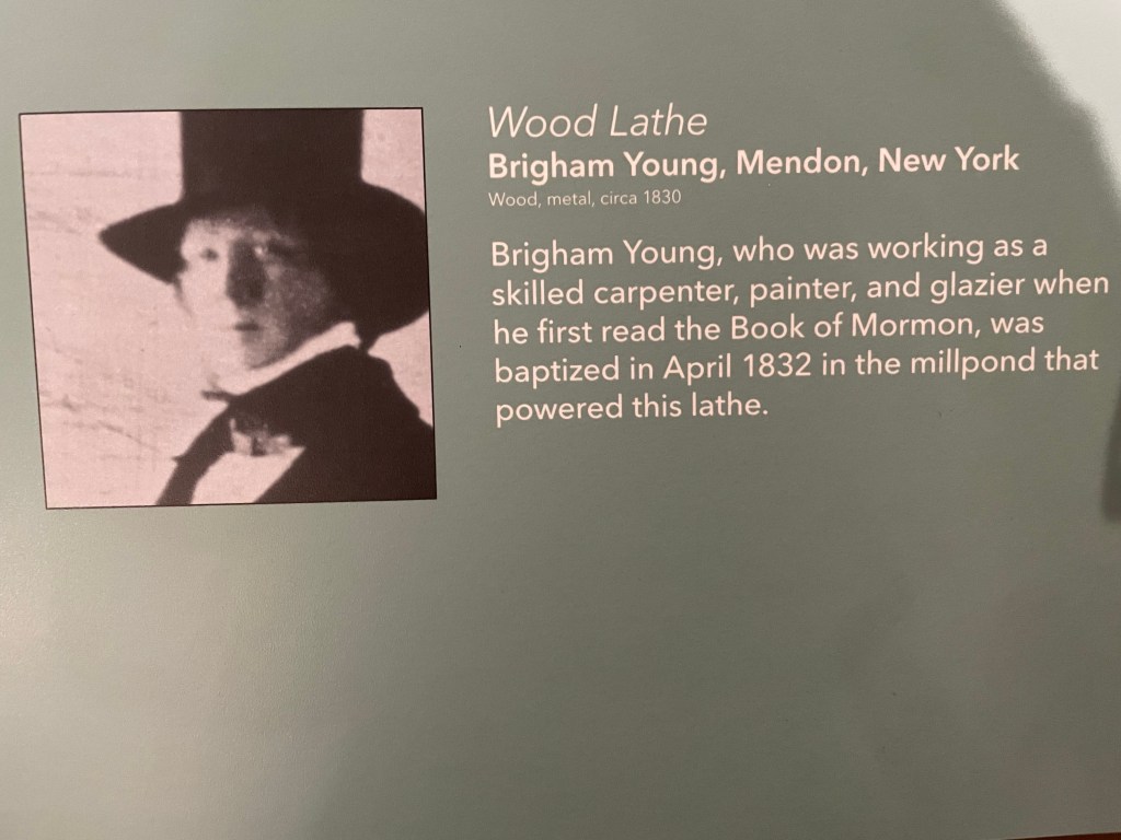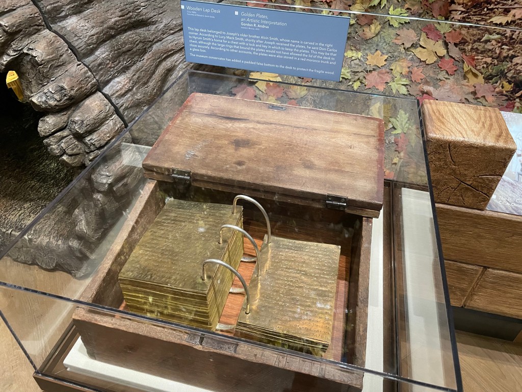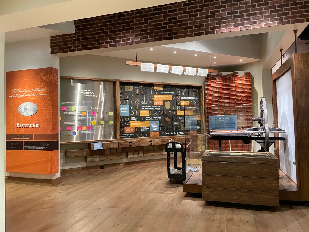 Inside the Church History Museum are exhibits in chronological order recounting the life of Joseph Smith, other founders and the founding of the church. Their struggle to find their Zion and how the church leadership and dogma evolved as more revelations came to Joseph Smith. The most important piece of the history is the Book of Mormon; how it came from a messenger from God, how a stone led to its translation and why the original is no longer available. A replica of the original, provided by Moroni, Son of Mormon, to Joseph Smith, is on display in the museum.