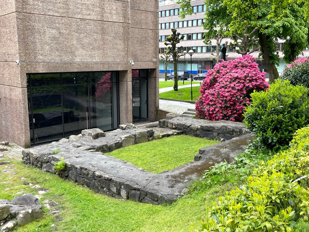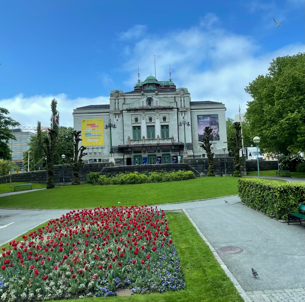 Back to the bus and a drive past the tents for the fish market open in the summer, old houses not destroyed by the most recent fire, the only cemetery left in the center of town, opera house, music hall and arrive at a Stave Church.