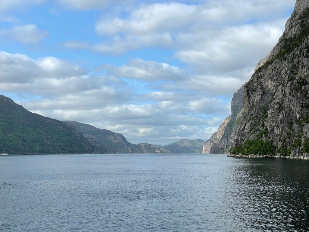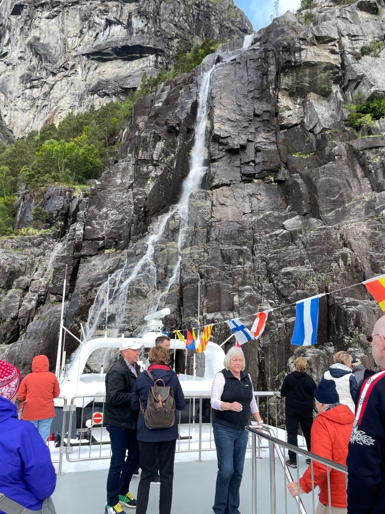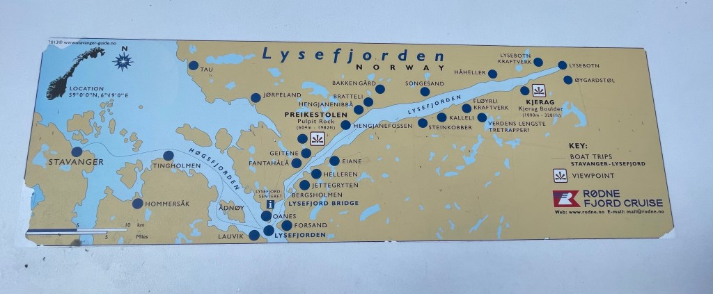 Our ship sailed back out the fjords last night into the North Sea and then to a peninsula where Stavanger, the 4th largest city in Norway, is located. Once docked, we are off the ship early to take a ferry boat to cruise up the Hogsfjord to the Lysefjord where we will see Pulpit Rock. We have amazing sunny weather – still a bit chilly – 48! We are told June 1st is considered the first day of summer.