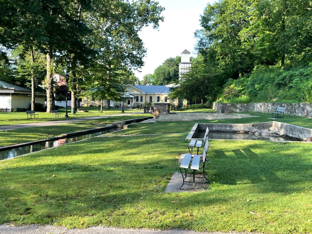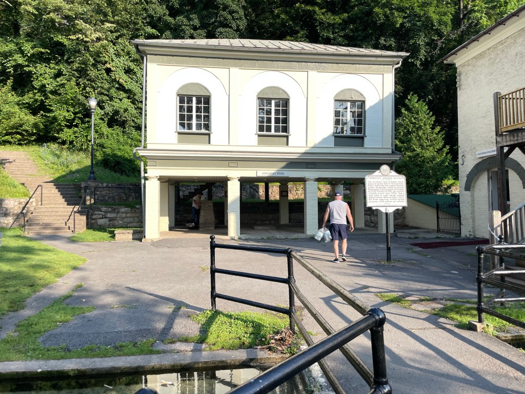 Here we are at mid-point of the 6 day trip – starting off Day 4. The hotel at Berkeley Springs is right next to the Berkeley Springs Baths – where the George Washington Bathtub is located. In the morning, we have breakfast and walk around the grounds. We see people coming up to an fountain area where they can fill up their own water jugs. The man says – hey, its free water.