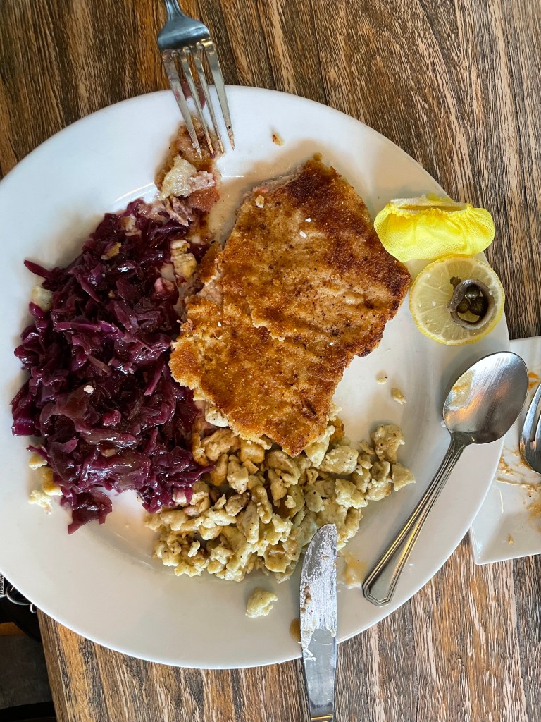 If a hotel is called Bavarian Inn and has an outside that looks like it was built in Germany, there must be German food. My dinner tonight, wiener schnitzel, red cabbage and spaetzle