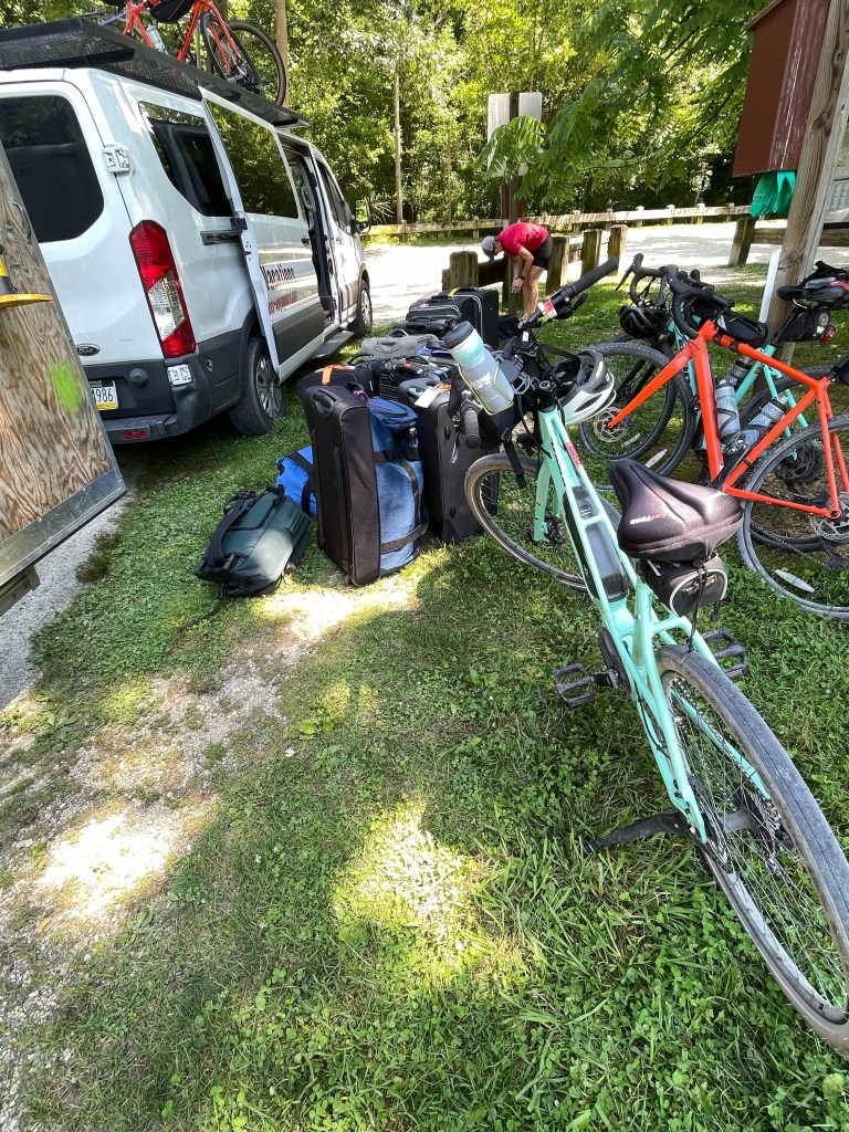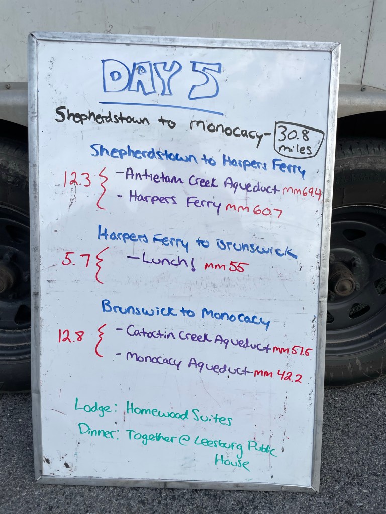 Now we are going back to the hotel and having our bikes unloaded from the trailer and ready to ride again on the bike tour down the Chesapeake & Ohio Canal Trail. A slight modification is happening because White’s Ferry is closed so we have to drive around to our hotel in Leesburg at the end of the day. Off we go!!