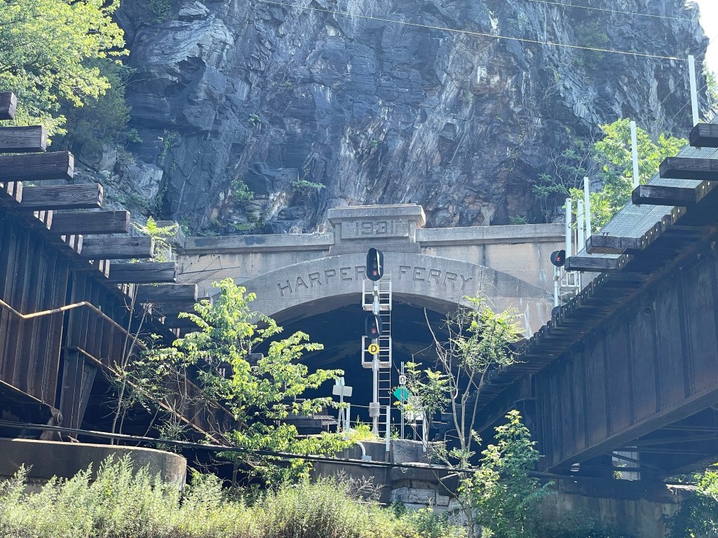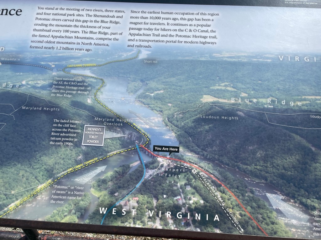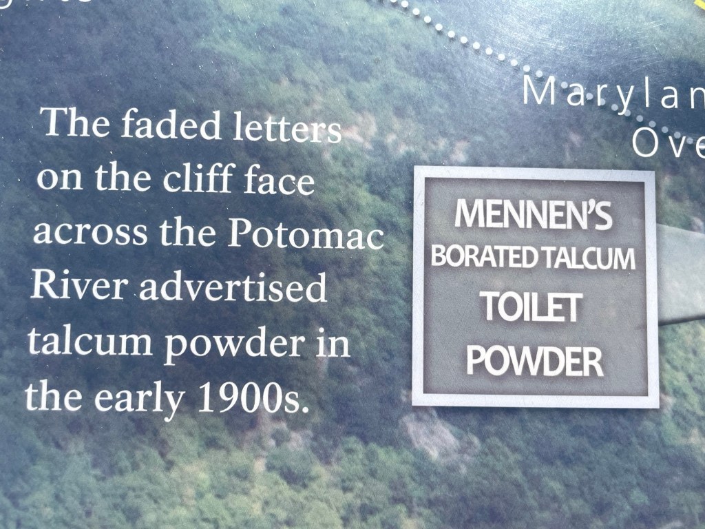 One little fun view is of the stone above the Harper’s Ferry train tunnel. It is faded but you can almost make it out – the first bill board? “Mennen’s Borated Talcum Toilet Powder.”
