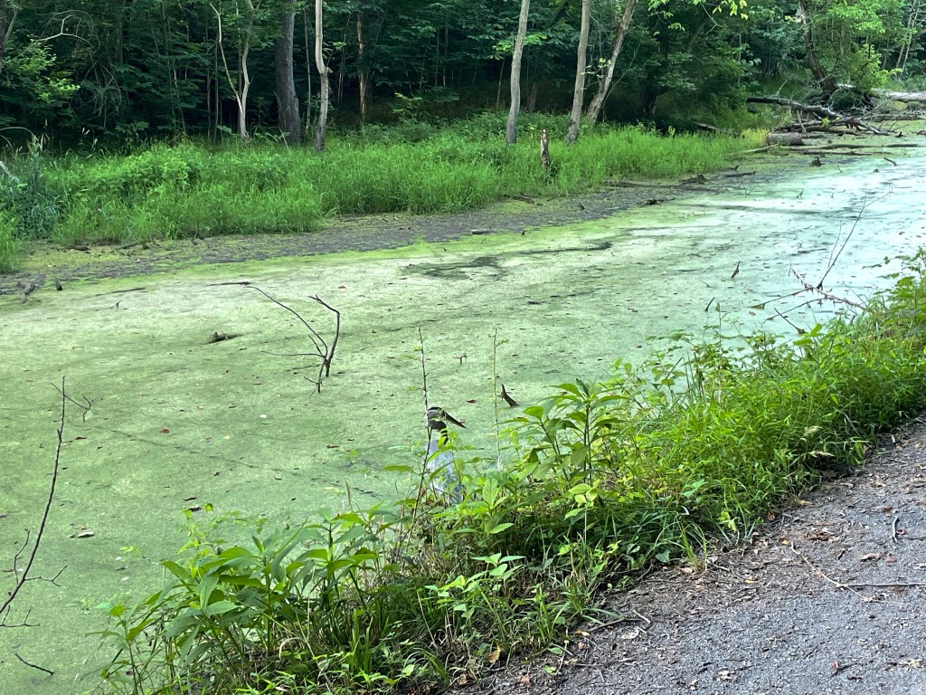 The trail starts off on gravel and is quite rough. The canal has water it in again with the green algae. I see a heron on the side looking for breakfast.