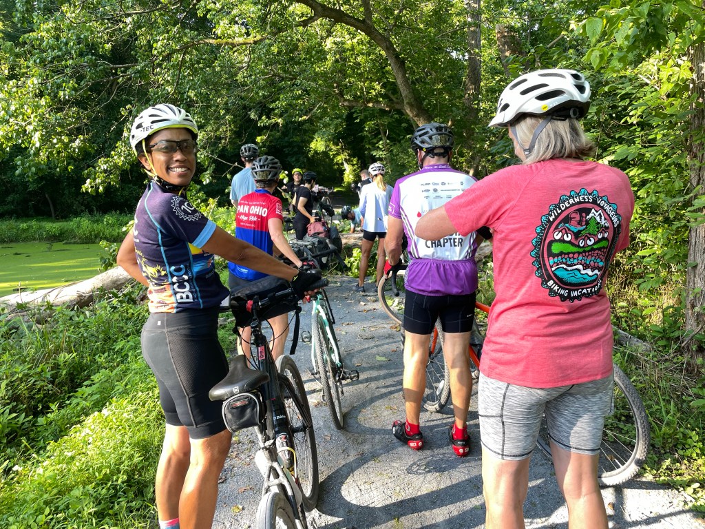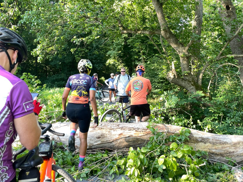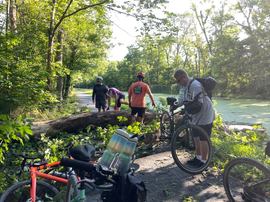 Not very far down the trail, we come across a huge tree that has come down directly on the towpath. We must stop and have our bikes lifted over the obstacle. Special thanks go to Geoff and Jim for helping get all our bikes over and moving again!