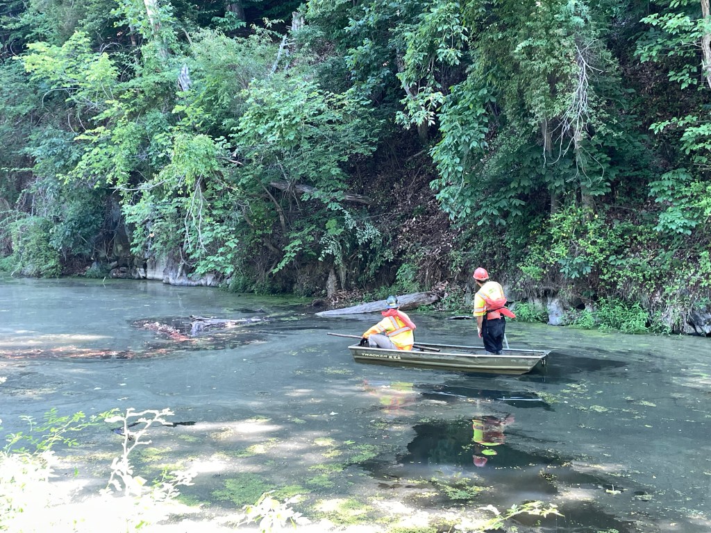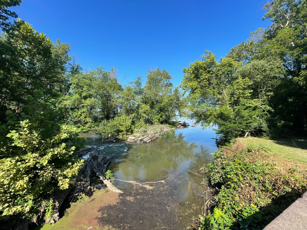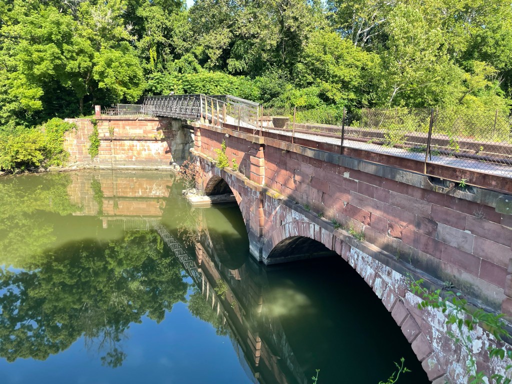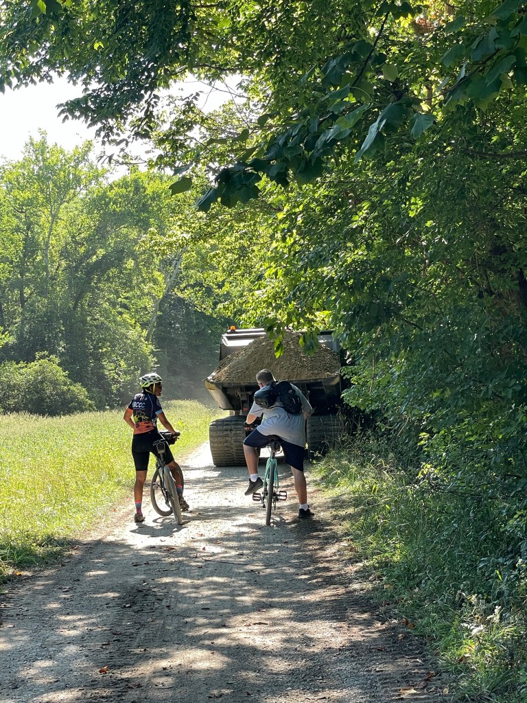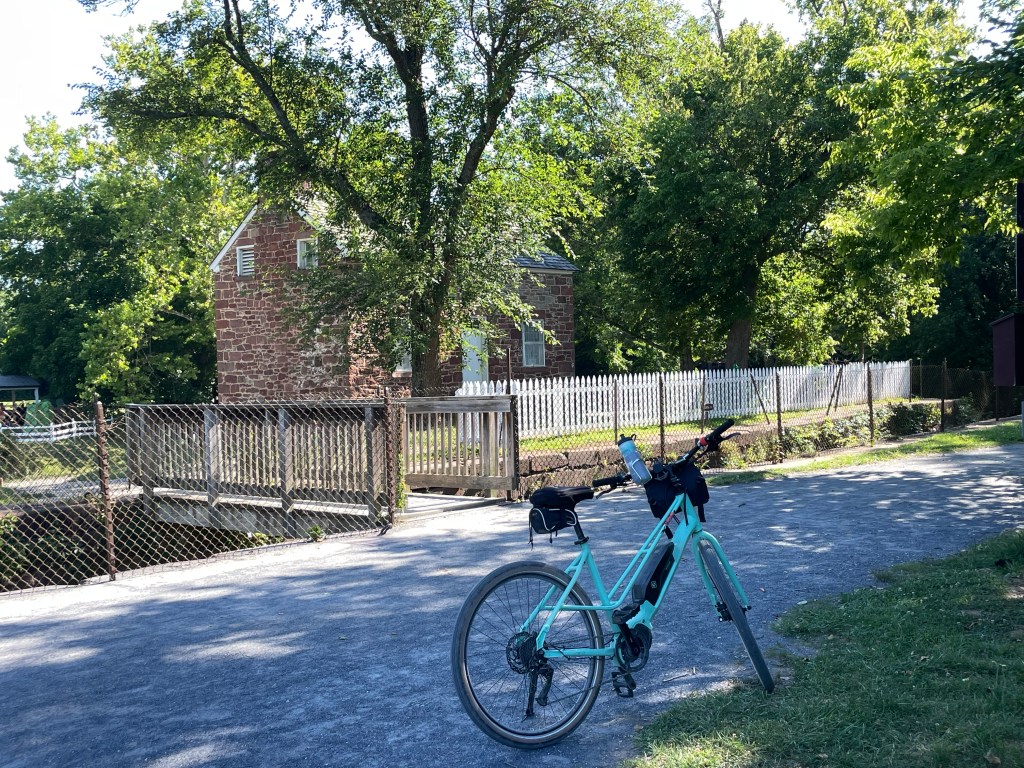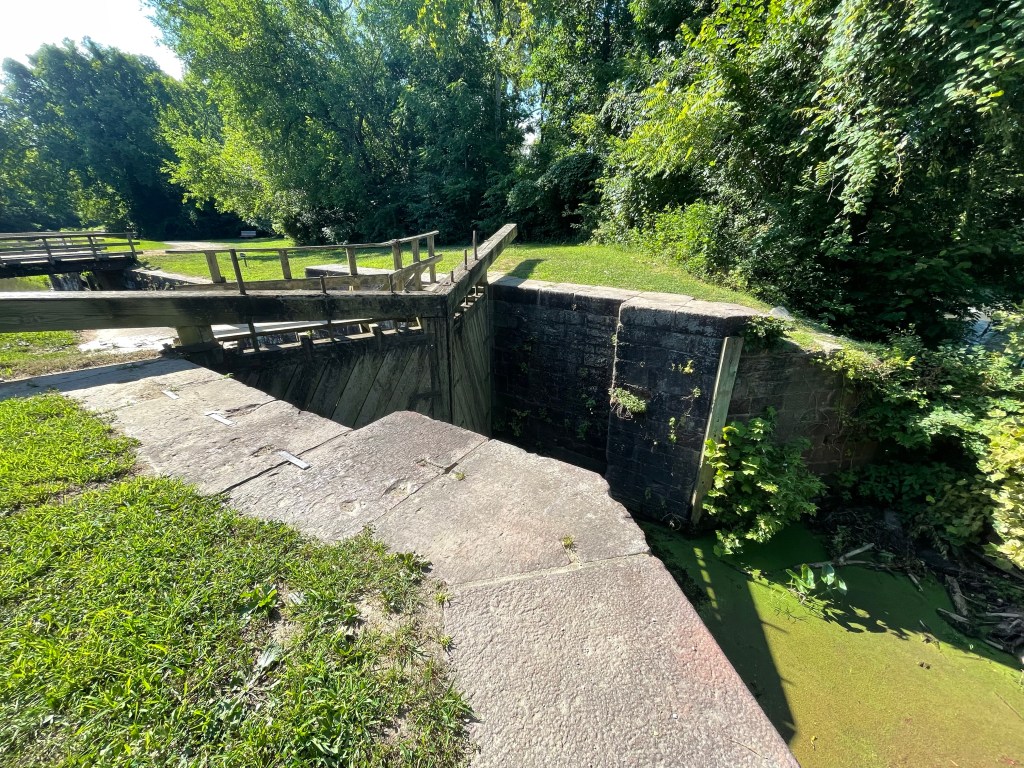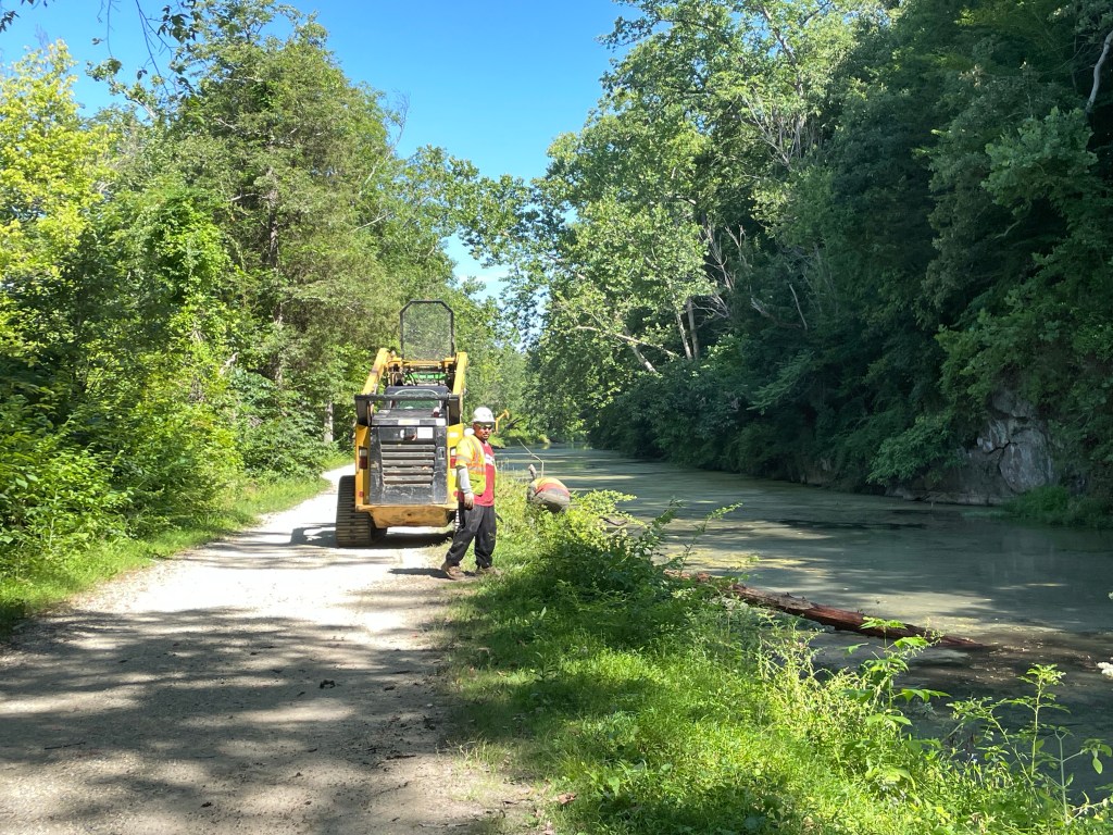Just past mile 21, we meet up with major work going on the towpath, trucks carrying gravel and dirt. We have to wait for them to pull off to the side before we can all pass. Then, a short distance from there, we see a crew working to remove large logs from the canal. I ask one of the workman what are they doing. He tells me that they are going to remove as a much of the trees as they can to then allow the river to flow into this part of the canal again. The National Park Service is working to keep this history available to anyone who wants to see and understand how this canal worked and benefited the people at the time.