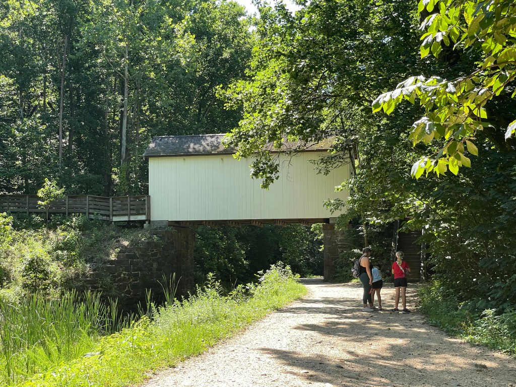 While we don’t see anymore workers on the towpath, the surface is still gravel and rock strewn. A few more locks and lock houses to enjoy. Many more people on this last day. Walkers, runners, bike riders and people just stopping to talk – like the ladies in front of the path to the lock house. This lock house is one of those that you can actually spend the night. The covered bridge appeared – a first – right near the Billy Goat Trail.
