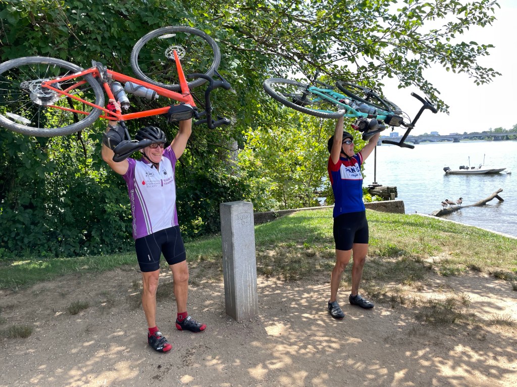 The group rides together to Mile 0. Everyone in our group made it safely, sweating and smiling and excited to plan another trip!