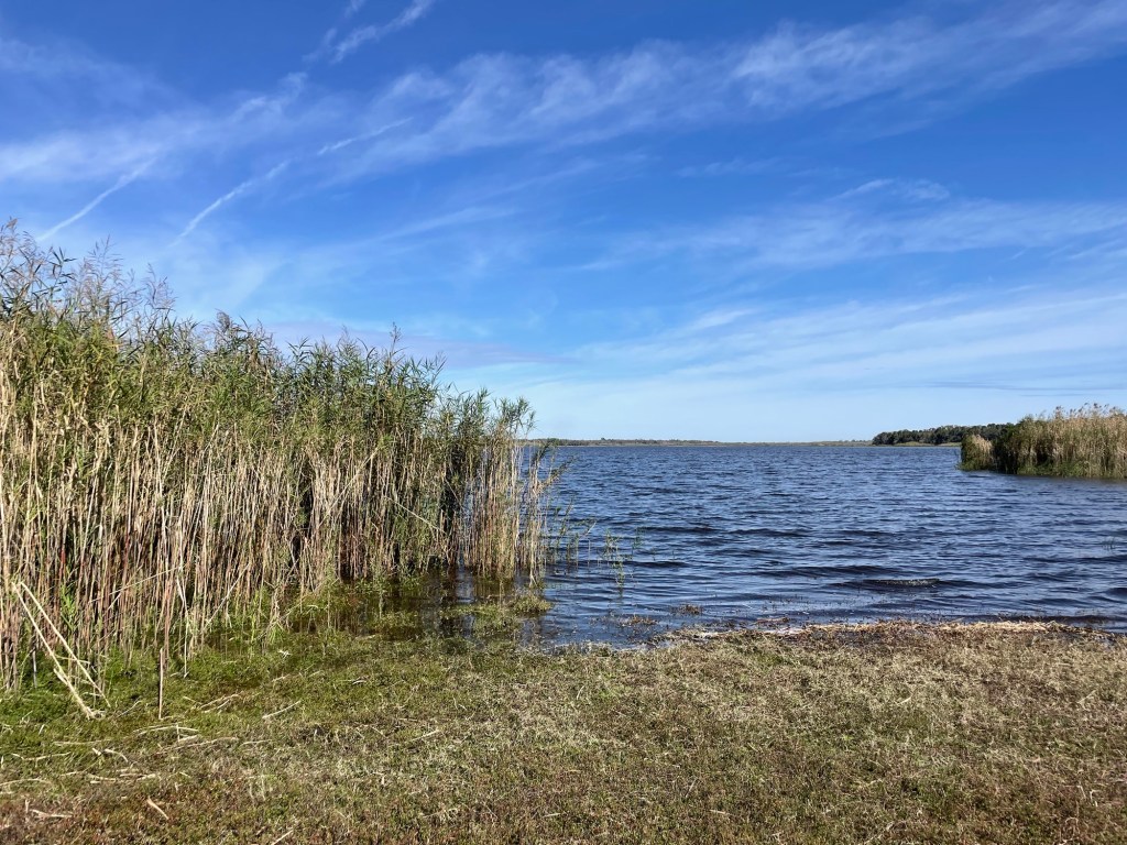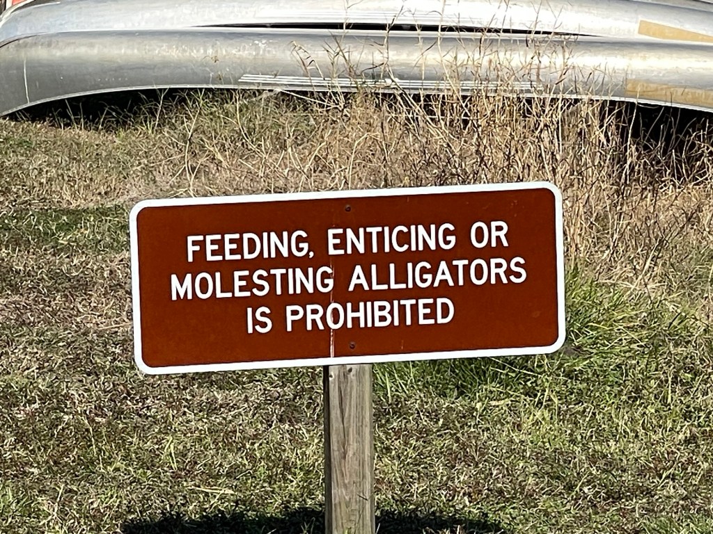 Spoiler alert – no alligators today! We actually did see one yesterday in a pond near our house. In mating season and warmer weather than today, you will see hundreds of alligators in the lake and river. Thus, the reason for a sign.