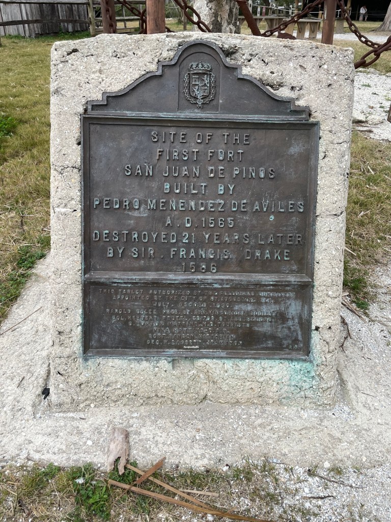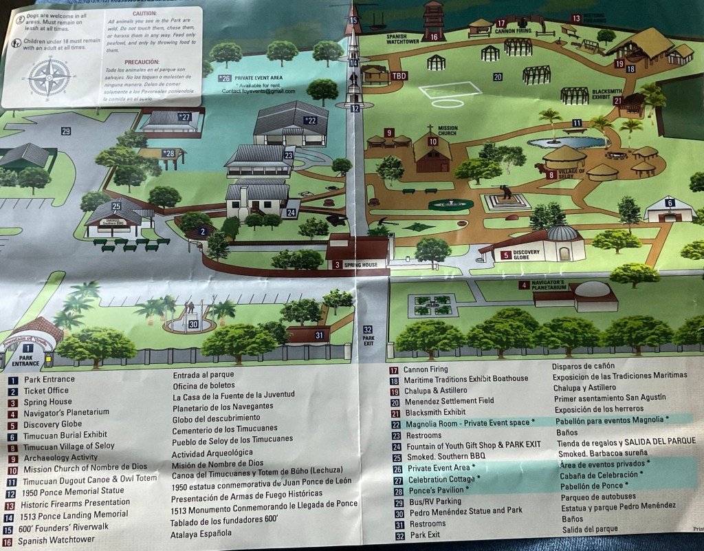 A short walk down the street and you are at the Fountain of Youth, a tourist attraction and not too kitschy (except in the gift shop). There is an archaeological dig section, still ongoing. There is also a Native American (Timucuan) village and a Spanish muster site resurrected in the area. It’s quite a large piece of land as you can see from this map. Live cannon shots daily and many live demonstrations of the life of early settlers and inhabitants of this land.