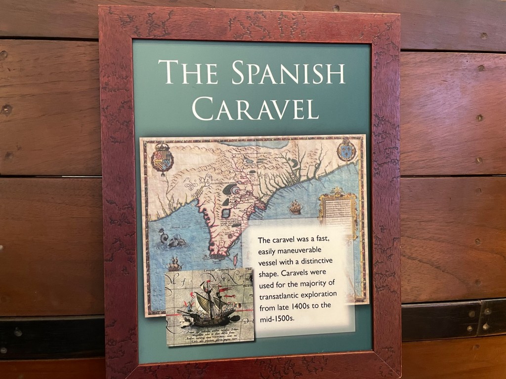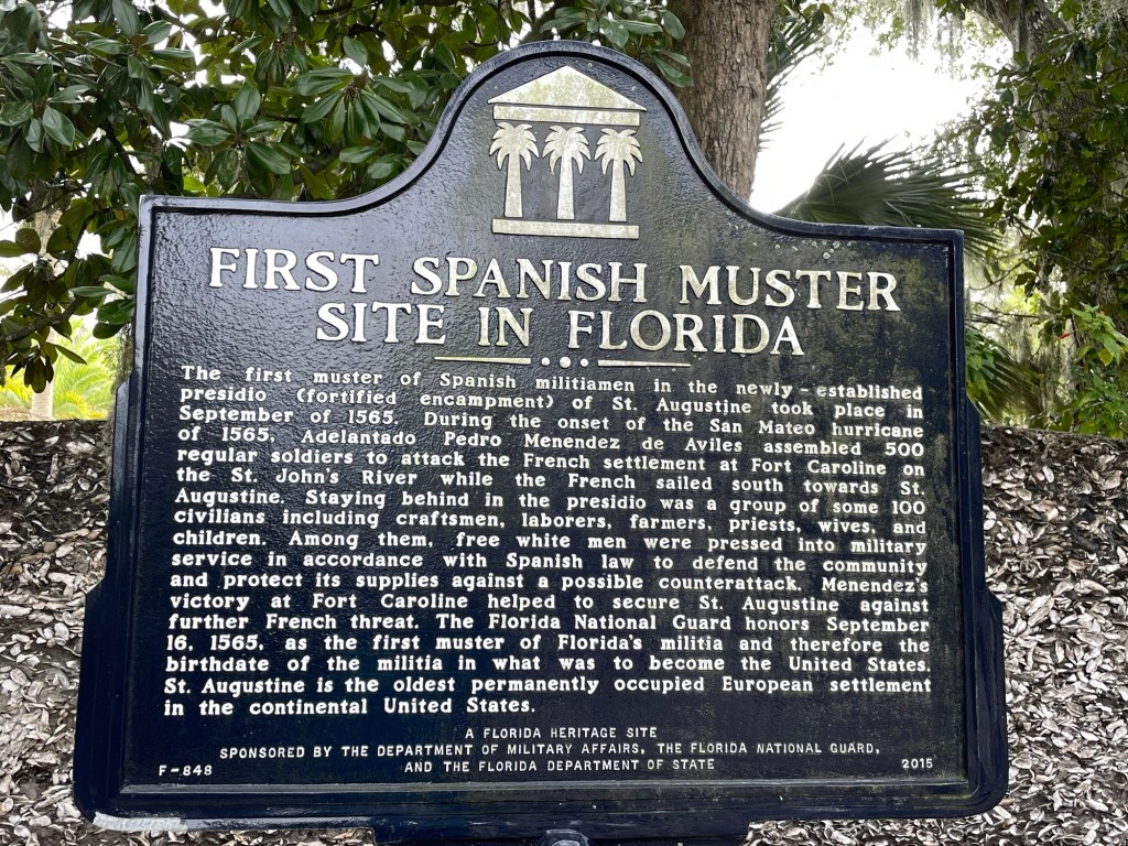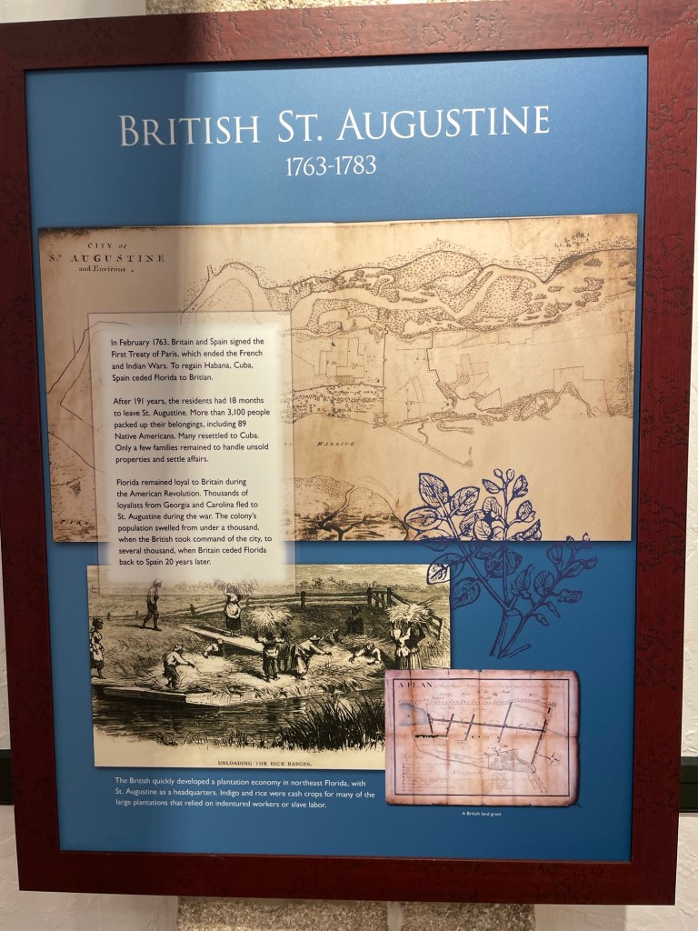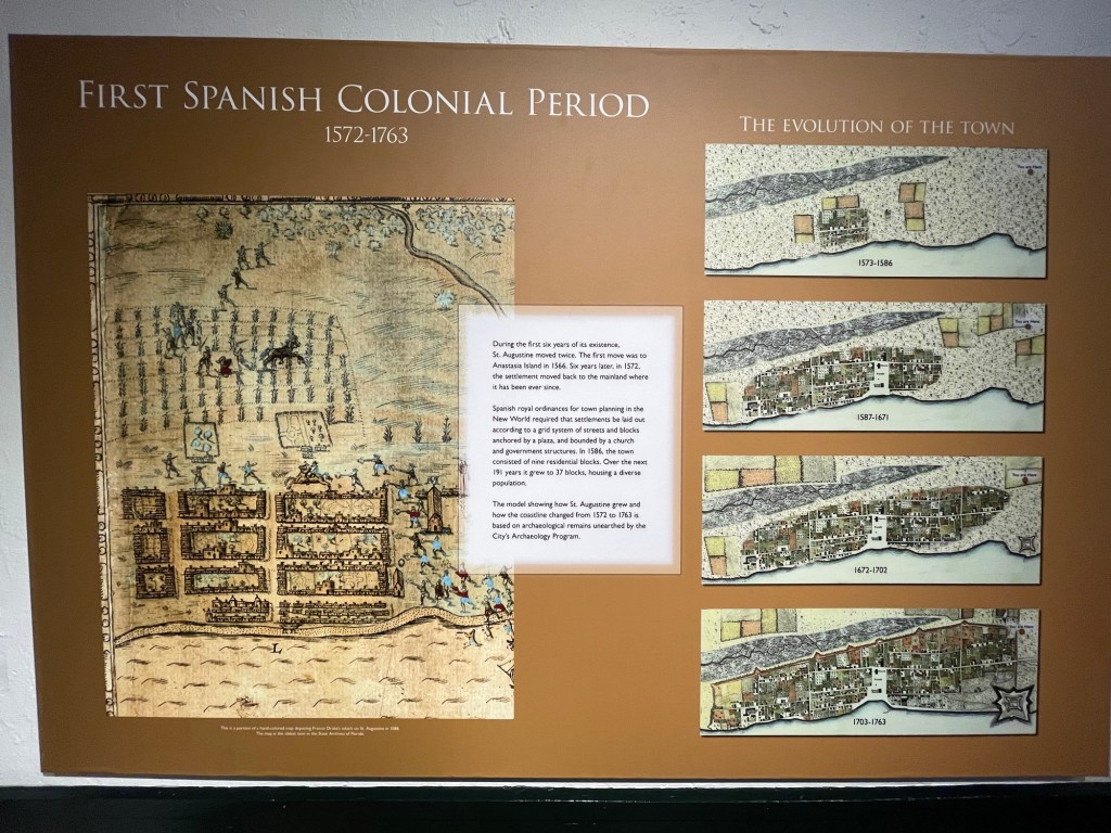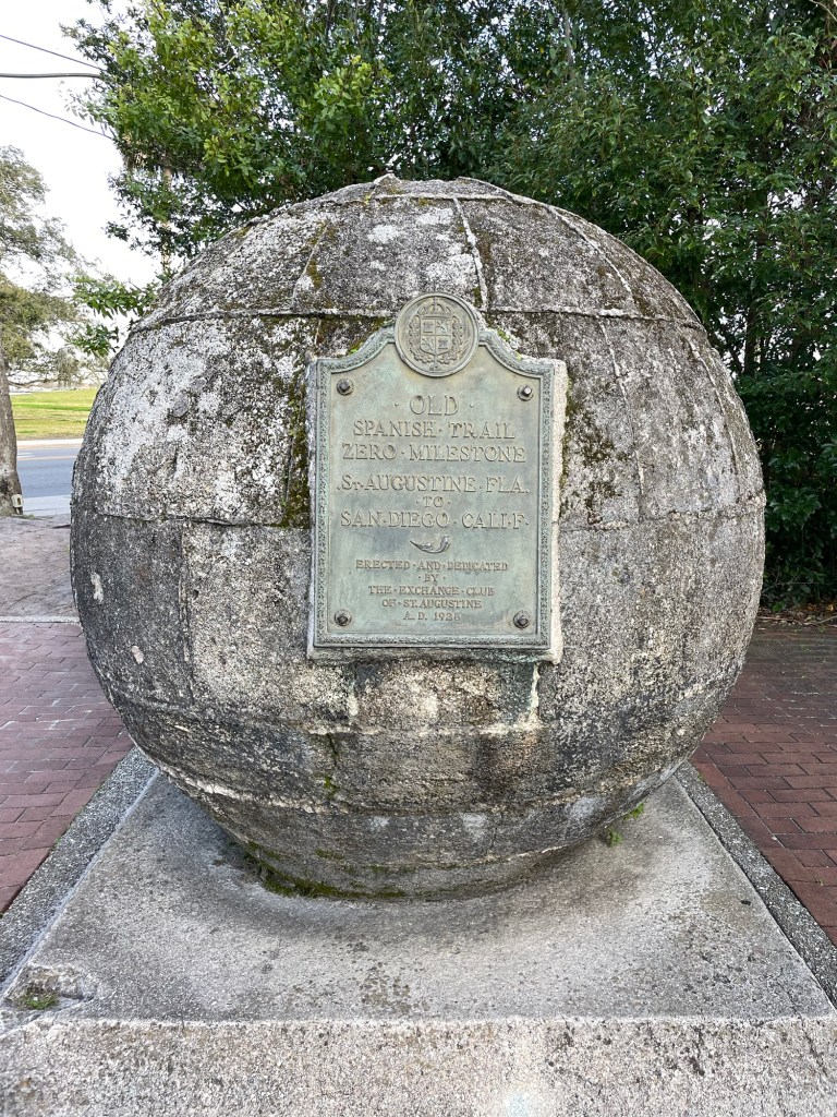 What do you do in St. Augustine first? Take the Trolley tour around the city. It takes one hour and 40 minutes, during which you can jump on and off. This is the easiest way to see everything or consider what you might want to go back and see or do. A trolley stop was right across the street from where we were staying, next to a parking garage whose architecture blended quite well with a square separating it from the Visitor’s Center. Right next to the visitor center was the Zero Milestone marker for the Old Spanish Trail which went from St. Augustine, FL to San Diego, CA. Inside the visitor center were excellent displays and exhibits telling the history. Worth seeing.