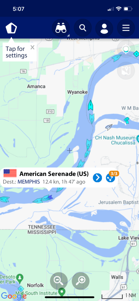 As we sail down the Mississippi River, others are sailing up. The lecturer told us about an app/website where you can identify the ships/barges as they pass by. Very cool – MarineTraffic.com. This screenshot is from yesterday and there we are!