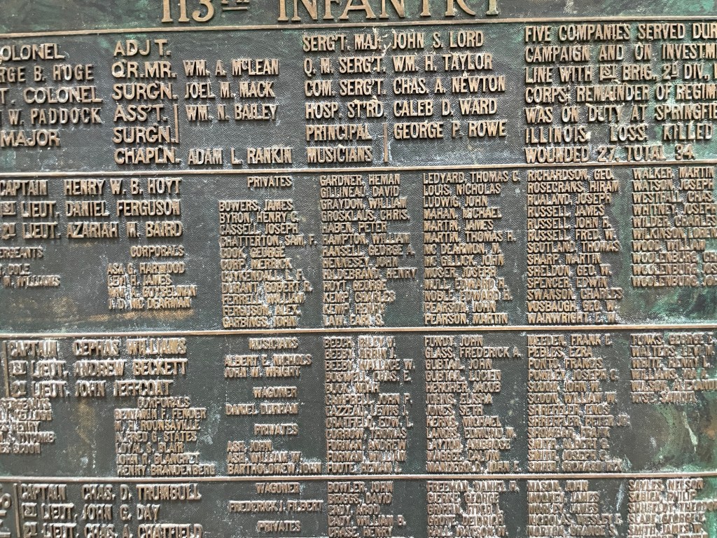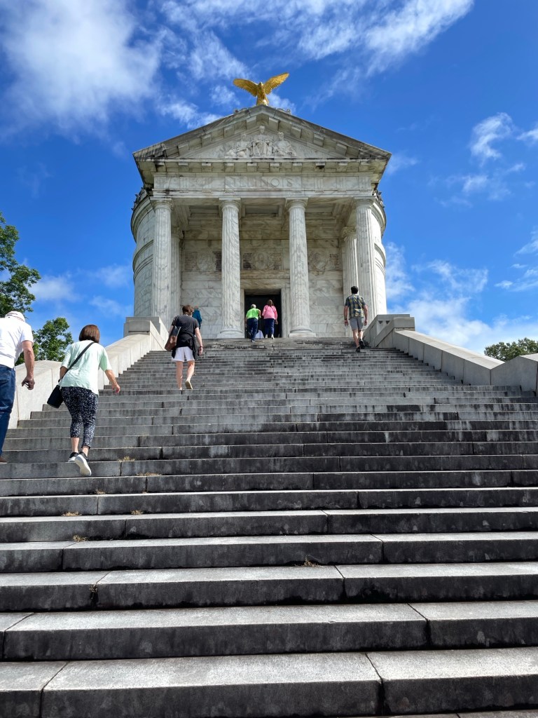 The largest is the Illinois monument. It has 47 steps leading up into a Pantheon shaped building. Inside are plaques with the names of every person who served from the 8th infantry to the 131st. Illinois had the most soldiers at this battle – 36,000. Other states built obelisks. There are also individual stone monuments for each division both confederate and union throughout where they were located when fighting. Our guide has many, many stories about the men and the battles.