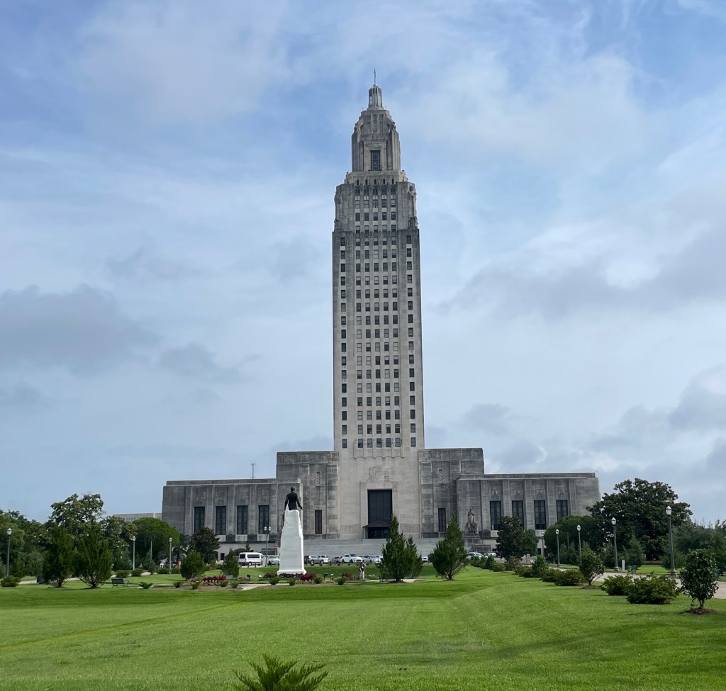 Huey P. Long was assassinated in this building in 1935 and he is buried on the grounds with his statue facing the Capitol.