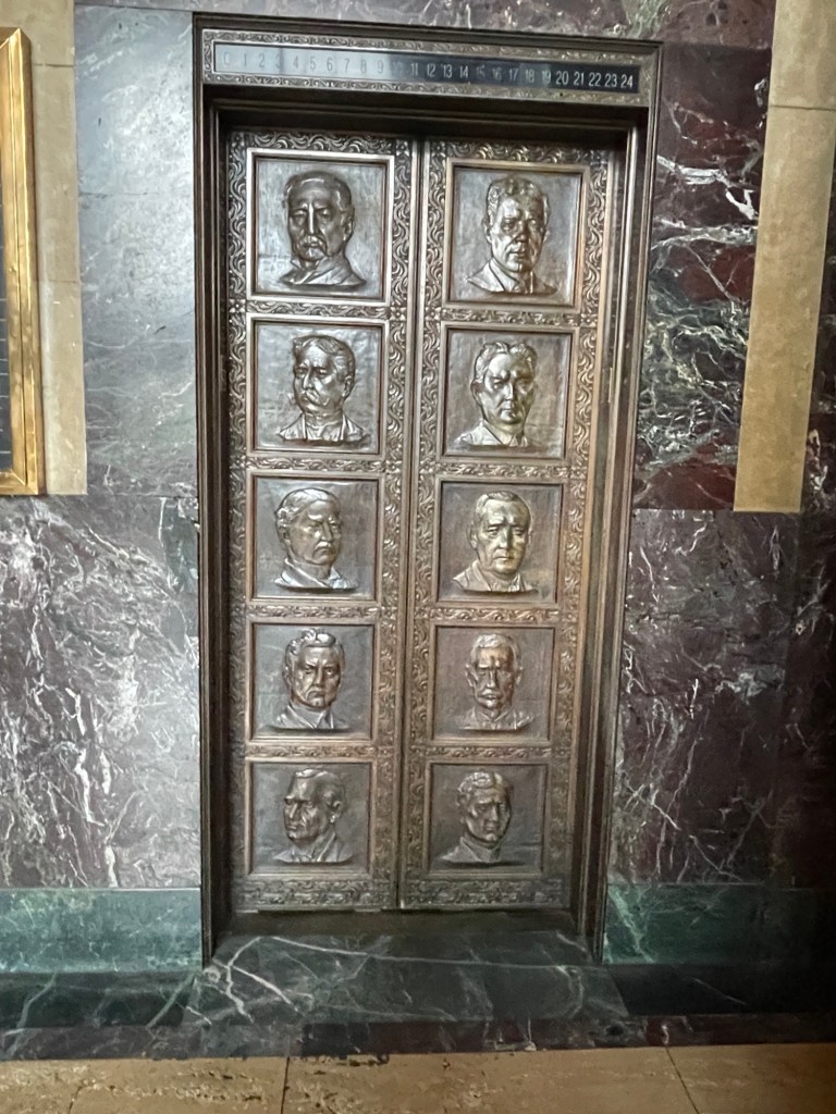 The elevator doors have the portraits of all American governors of Louisiana….and going up to the observation deck the elevator makes sure you know which one you should use!