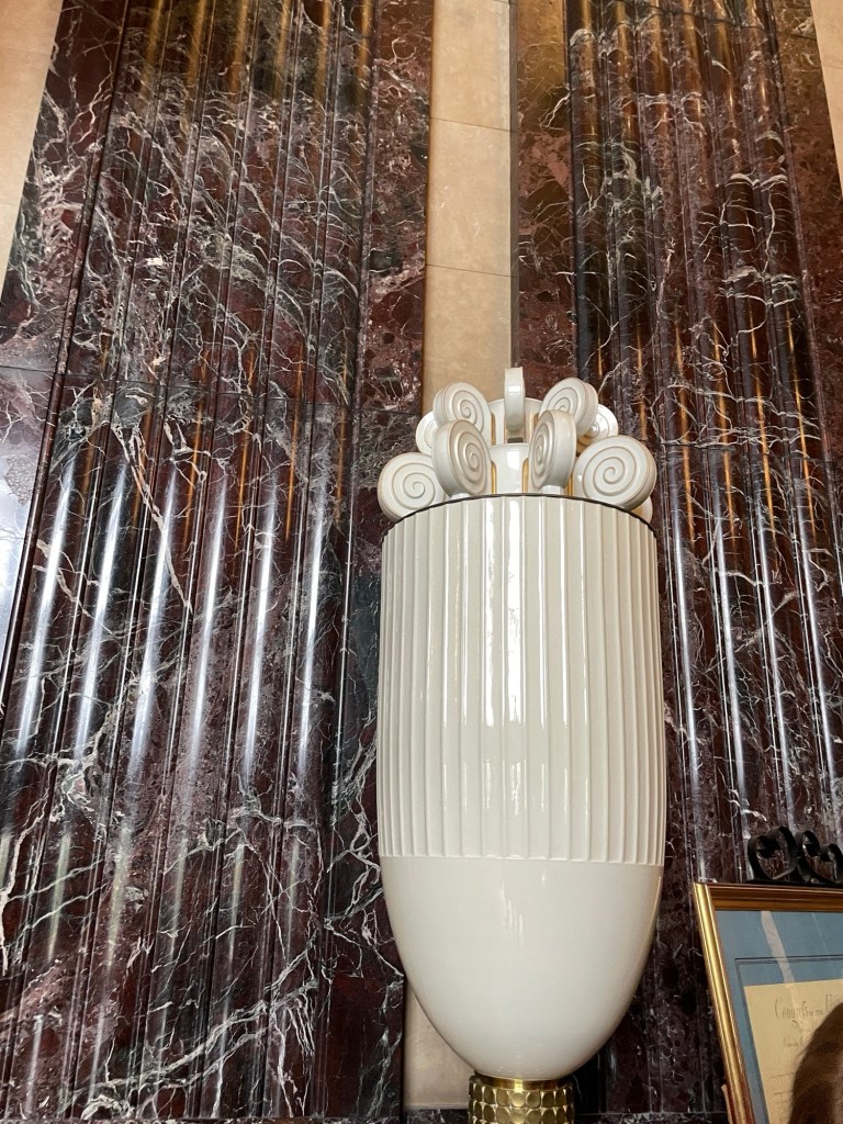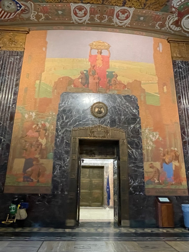 The inside called Memorial Hall is classic art deco with the marble walls from Italy, large vases from France, floor tile made from Mt. Vesuvius, granite from Vermont, and oil painted tapestries on either wall, gifts from France.