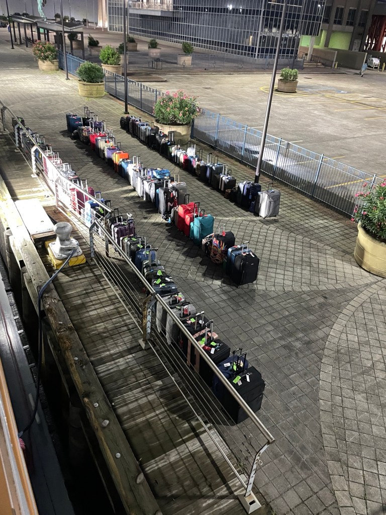 We are rise early to disembark the ship and board a motorcoach to the New Orleans airport. Sadly, we leave this wonderful cruising adventure for home. The suitcases are ready for us so off we go.