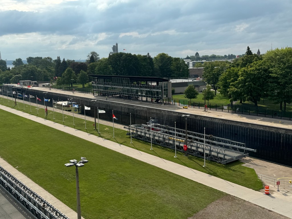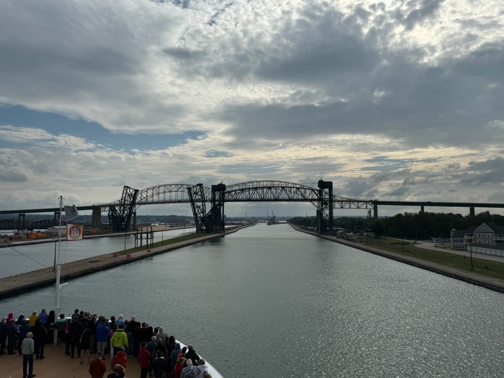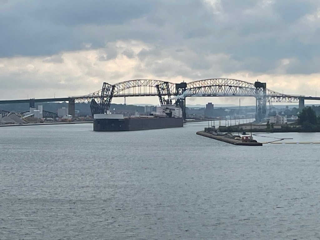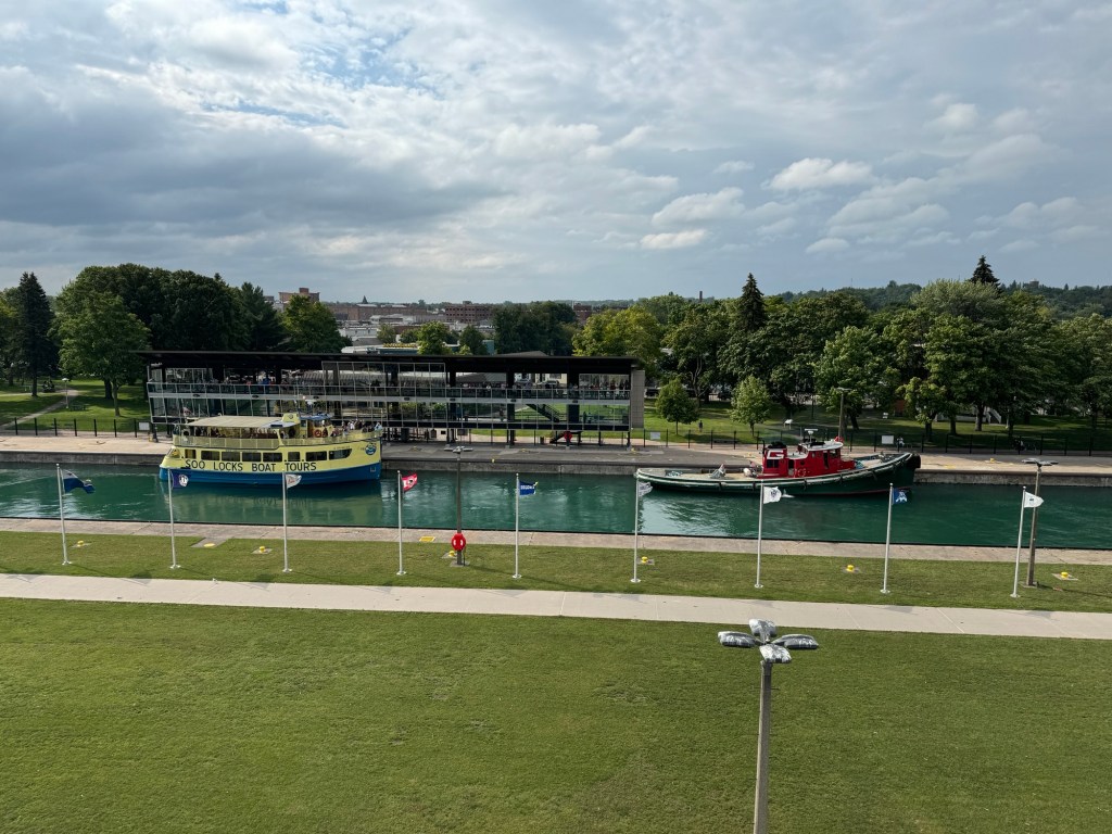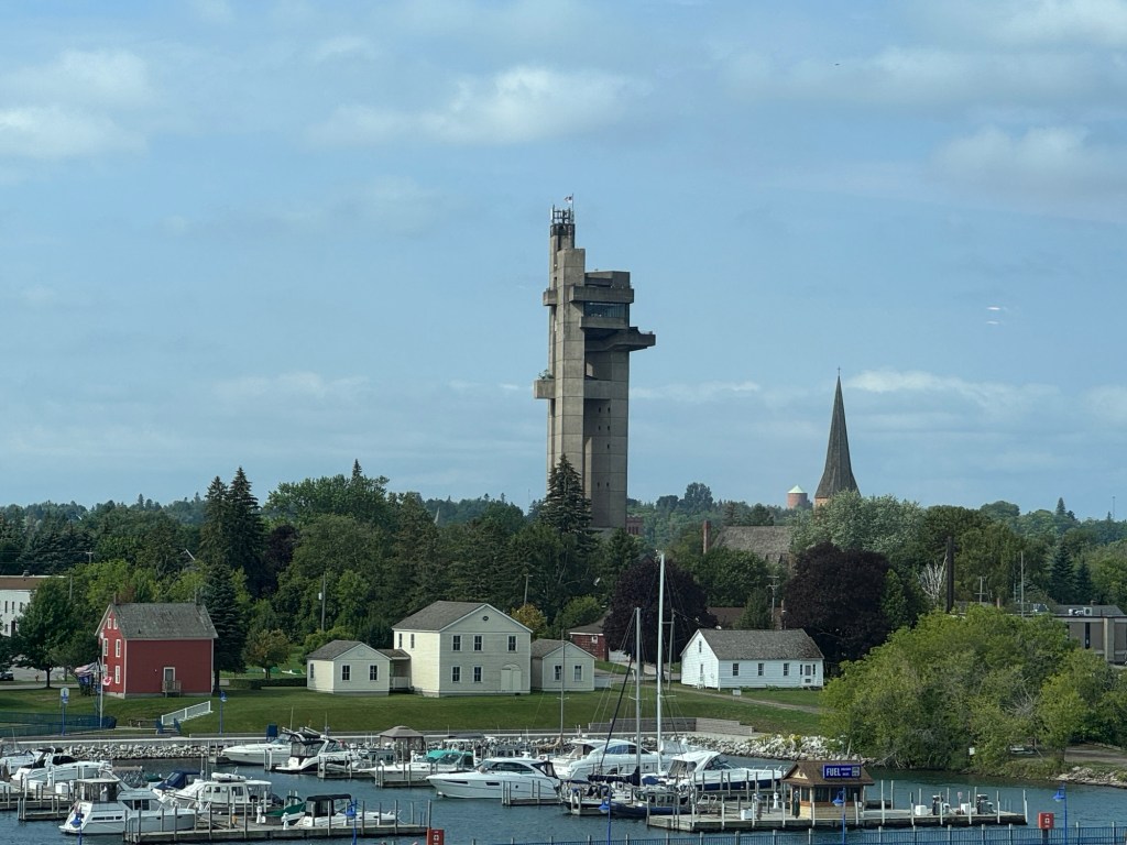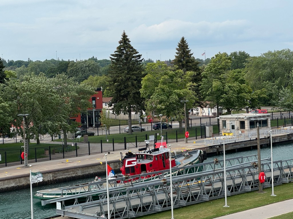 We will now be in St. Mary’s River passing by the city of Sault Ste. Marie. A tall tower called the Tower of History is the main structure we can see besides homes. The tower was built by the Catholic Church as a tribute to all the missionaries that helped settle this area.