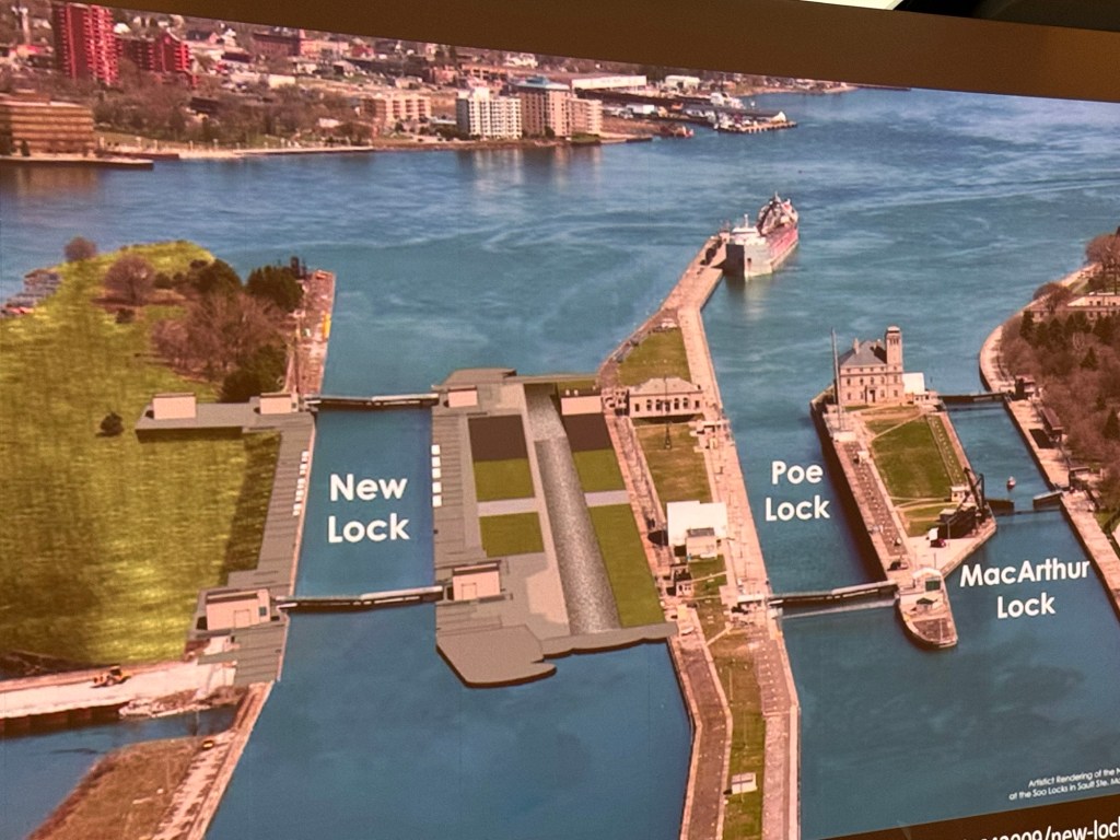 The ship is transiting the Poe Lock. The other lock is currently allowing a couple of boats from Lake Huron to enter to allow them to get over to Lake Superior. There is viewing stand on the USA side.