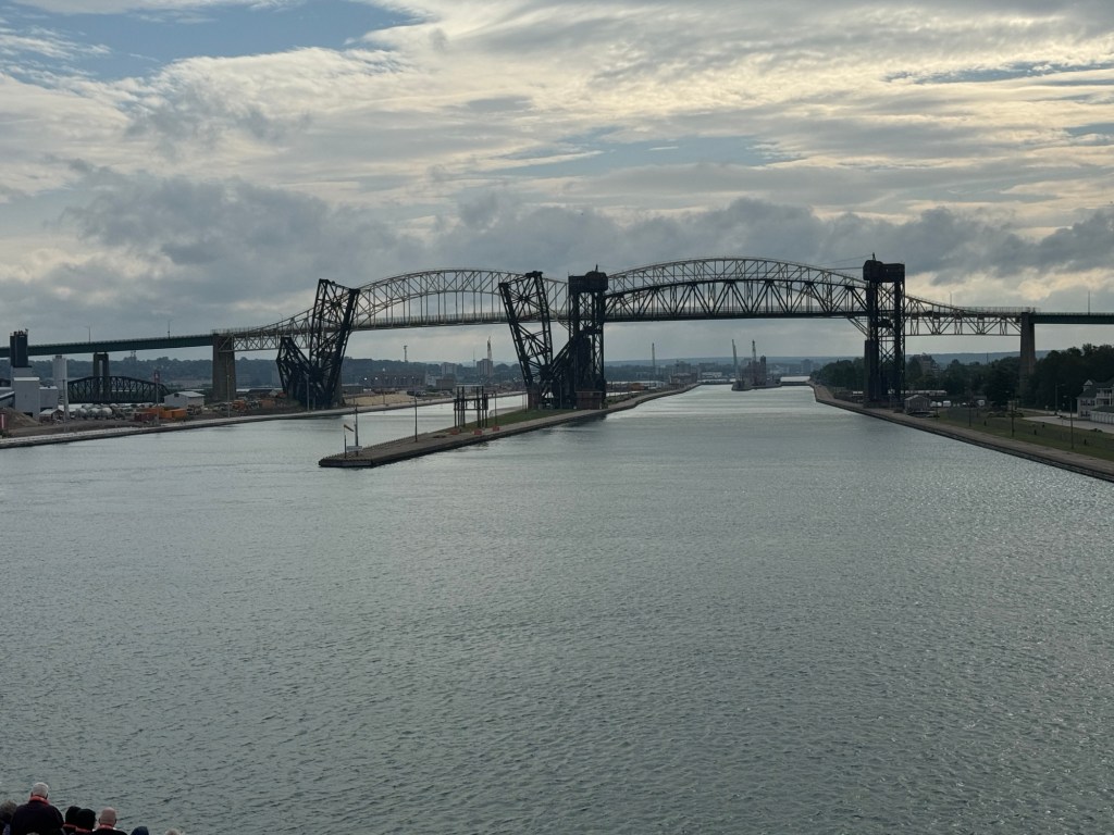 The bridges come into view, car bridge and rail bridge across the St. Mary’s River. The locks were created because of the river rapids creating a difference of 24 feet between Lake Superior/St. Mary’s River connection with Lake Huron. On the left side, the rail bridge goes up like a toll bridge while on the other side, it raises up with a pulley system.