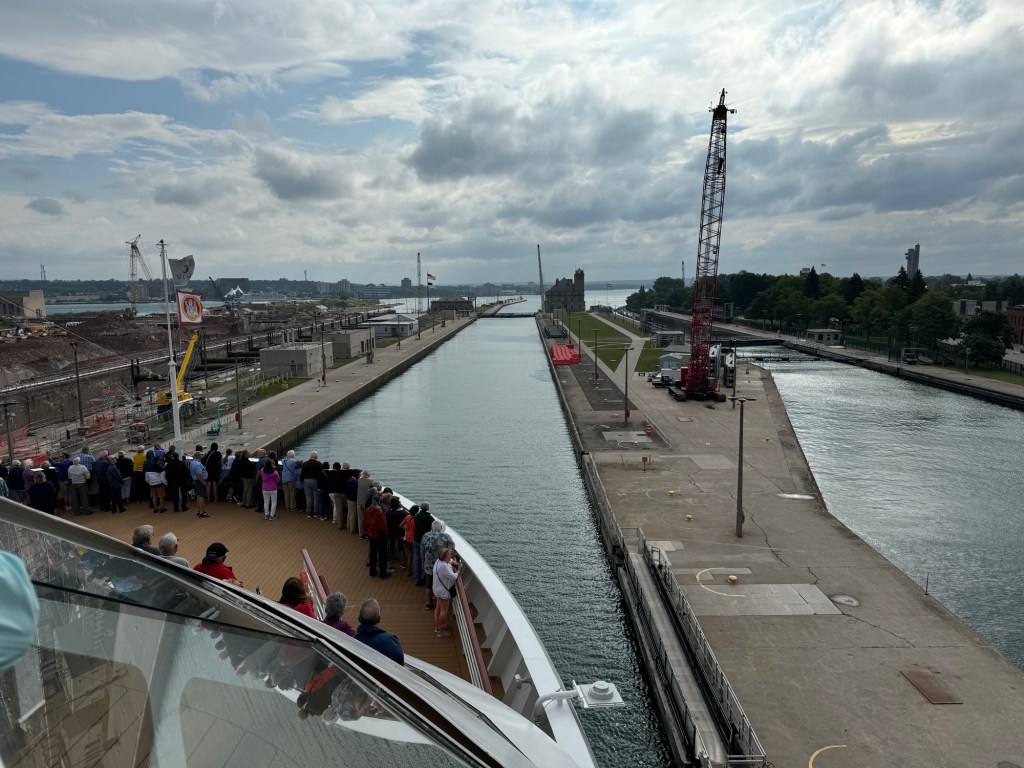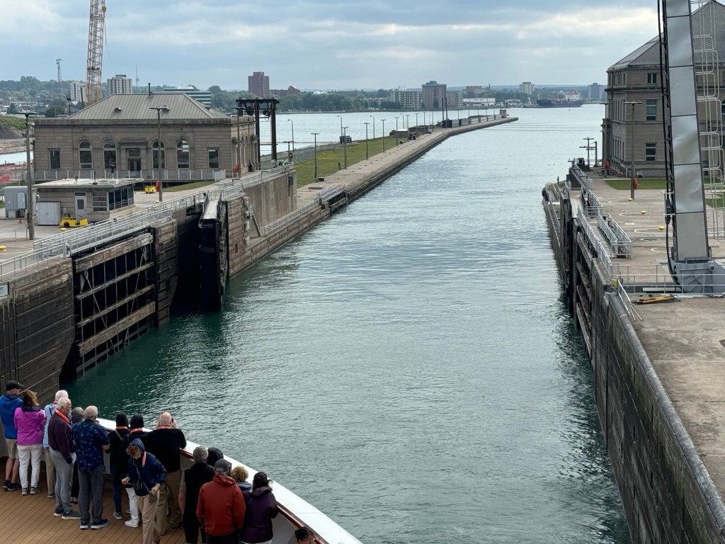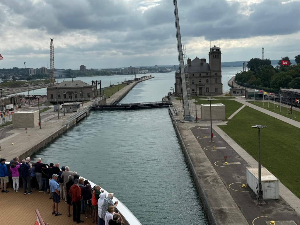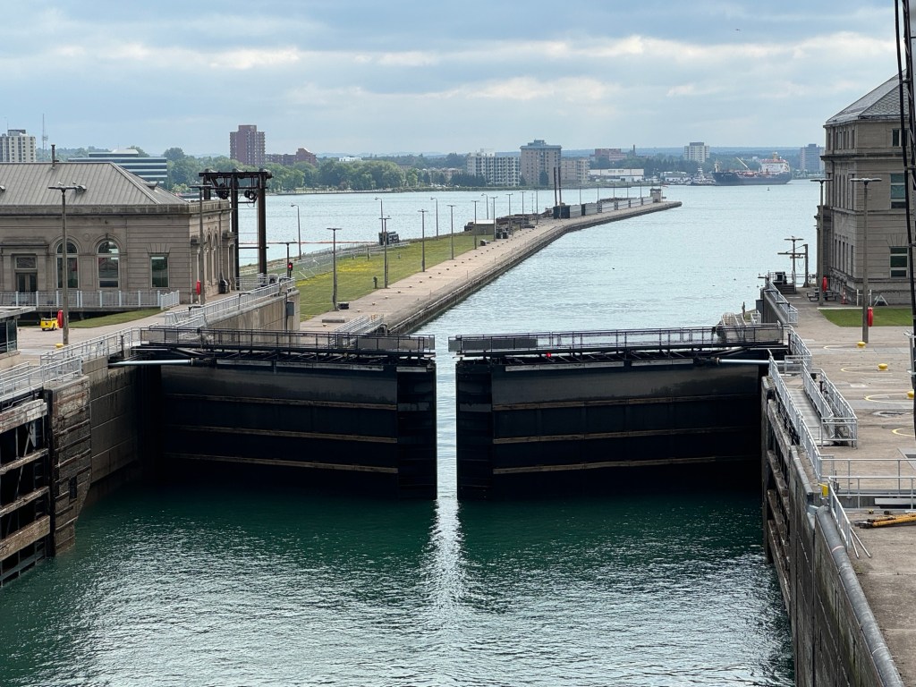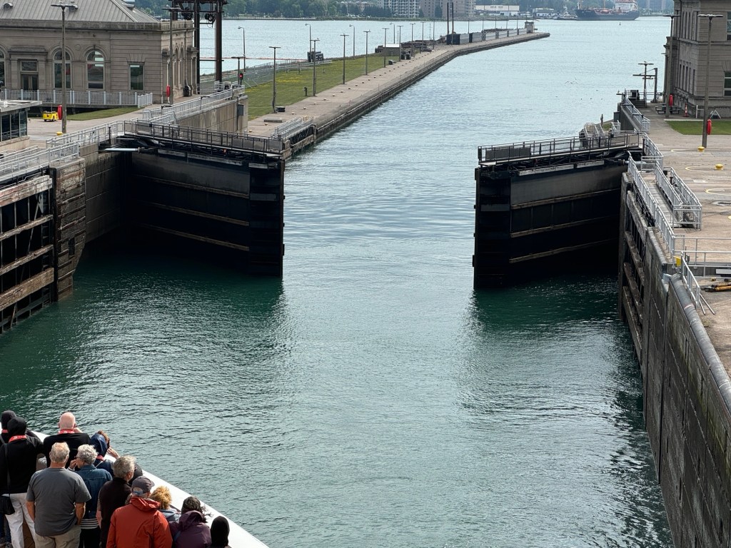 Our ship barely fits in the Poe Lock so it inches in slowly. Finally we are in and they can start releasing the water. A video of this would be sooooo long. It took about an hour for us to enter, tie down, and release the water so we could sail out into Lake Huron.