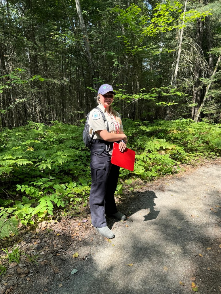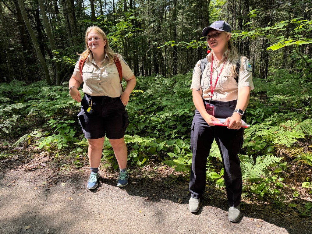 To get to the Killarney Provincial Park, we board a bus for a 15 minute ride. This hike is really a walk on a gravel pathway through a campground to Lake George and then back to the visitor center. We are led by the park naturalists who work for the park during their summers.
