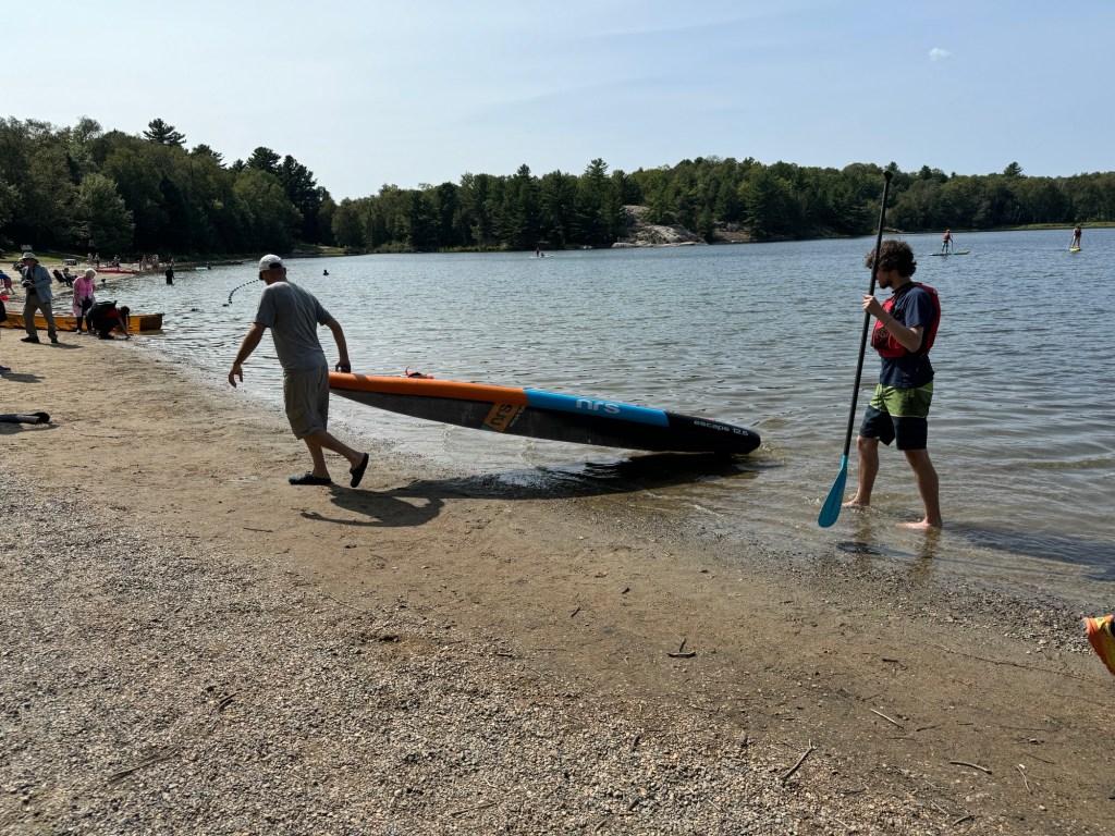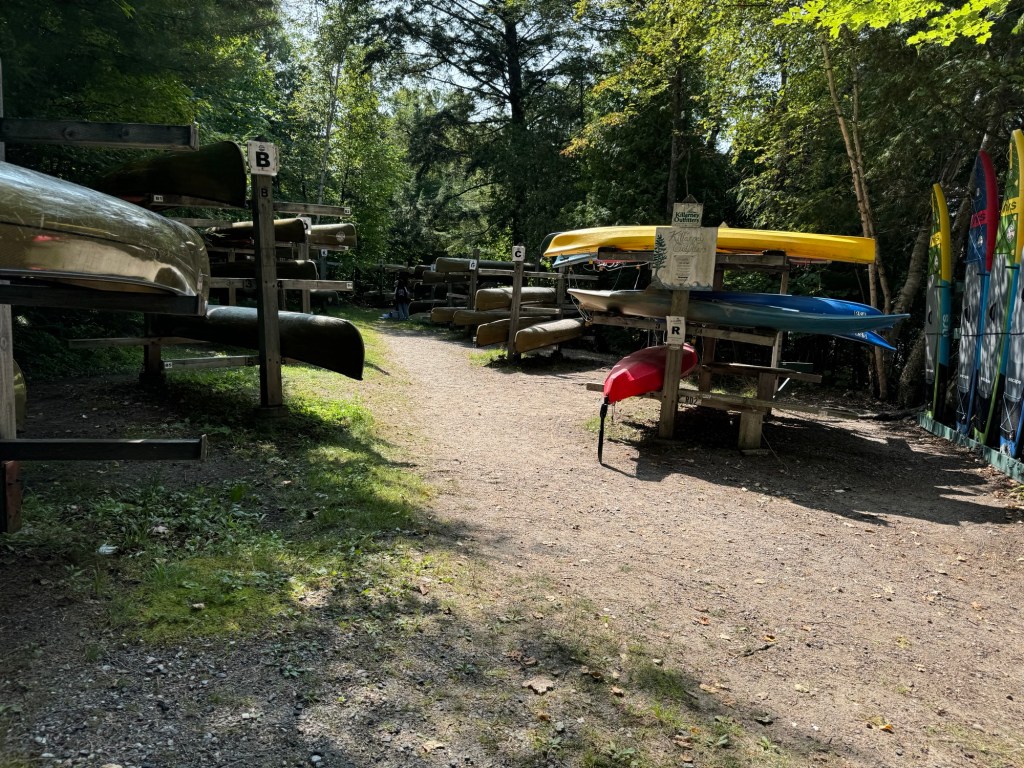 The trail takes us to Lake George. We can see people enjoying the warm summer day on the lake. Unfortunately, because of the mining industries early in the 20th century, acid rain fell and killed all the fish and much of the wildlife. The lake is tested for acidity regularly and fish are staging a come back. The small creek flowing into and out of the lake is called Trout Creek – with currently no trout. Easy to rent a canoe, kayak or paddle board right by the lake. One of the main hikes in the park starts here – 86 km!