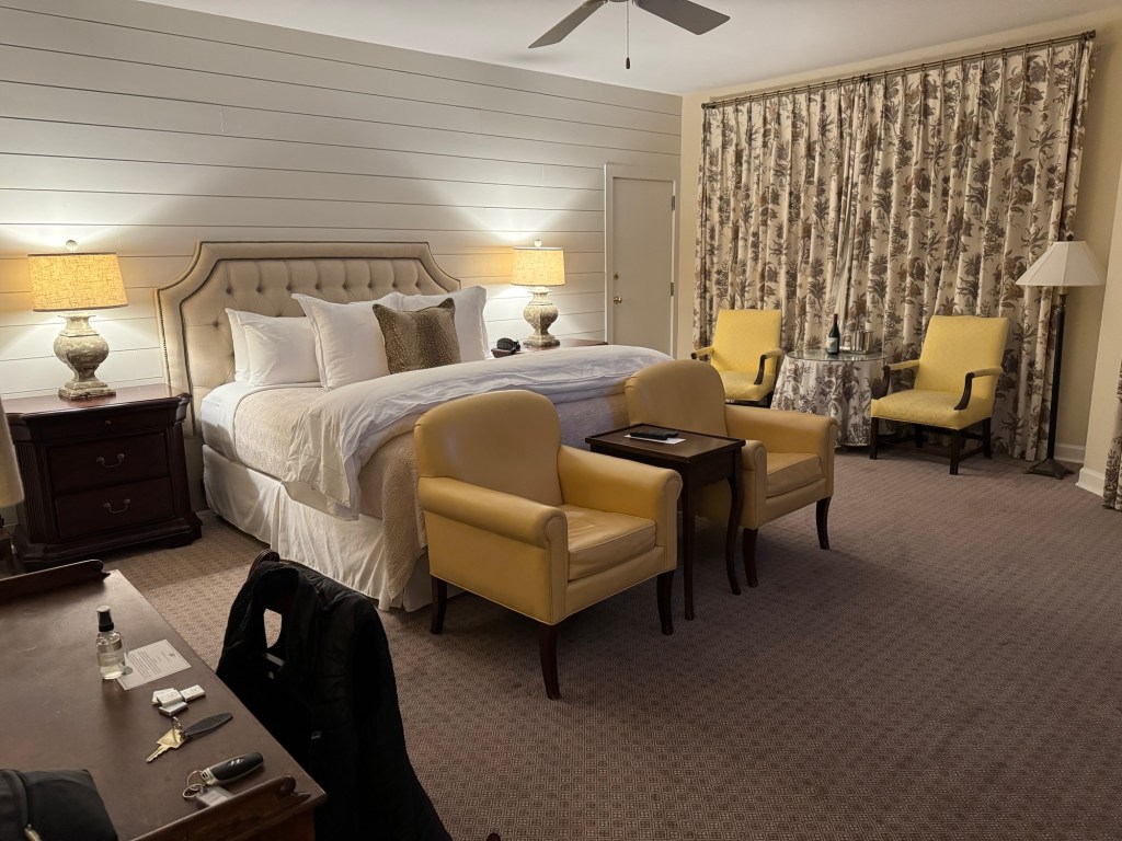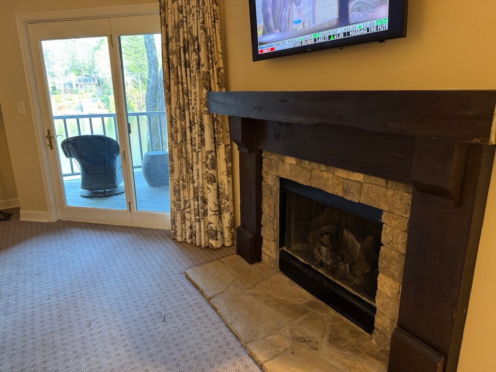 Once on the ground at Asheville airport, find the rental car and start the drive to Lake Toxaway at 10 PM. Since it is so dark and hardly any cars are on the roads, I do not see any signs of Hurricane Helene damage. There is one part on the drive where I do have to stop because it is a one-way section where the road must be under repair. It is too dark to even see what might be going on. I arrive at the hotel at 11:15 pm after getting somewhat lost in the area where the Greystone Inn is located. Worth the drive to settle in to the beautiful accommodations. The morning view from the balcony makes me excited for this next few days of vacation!
