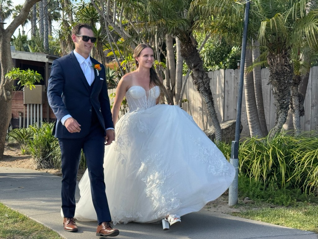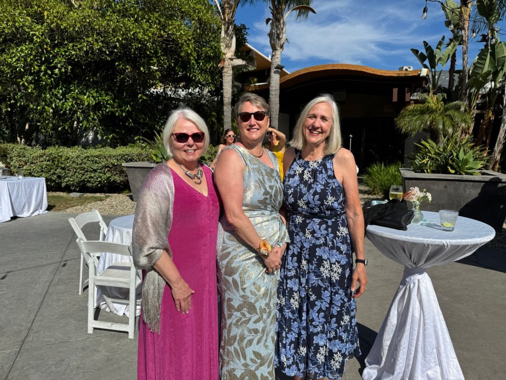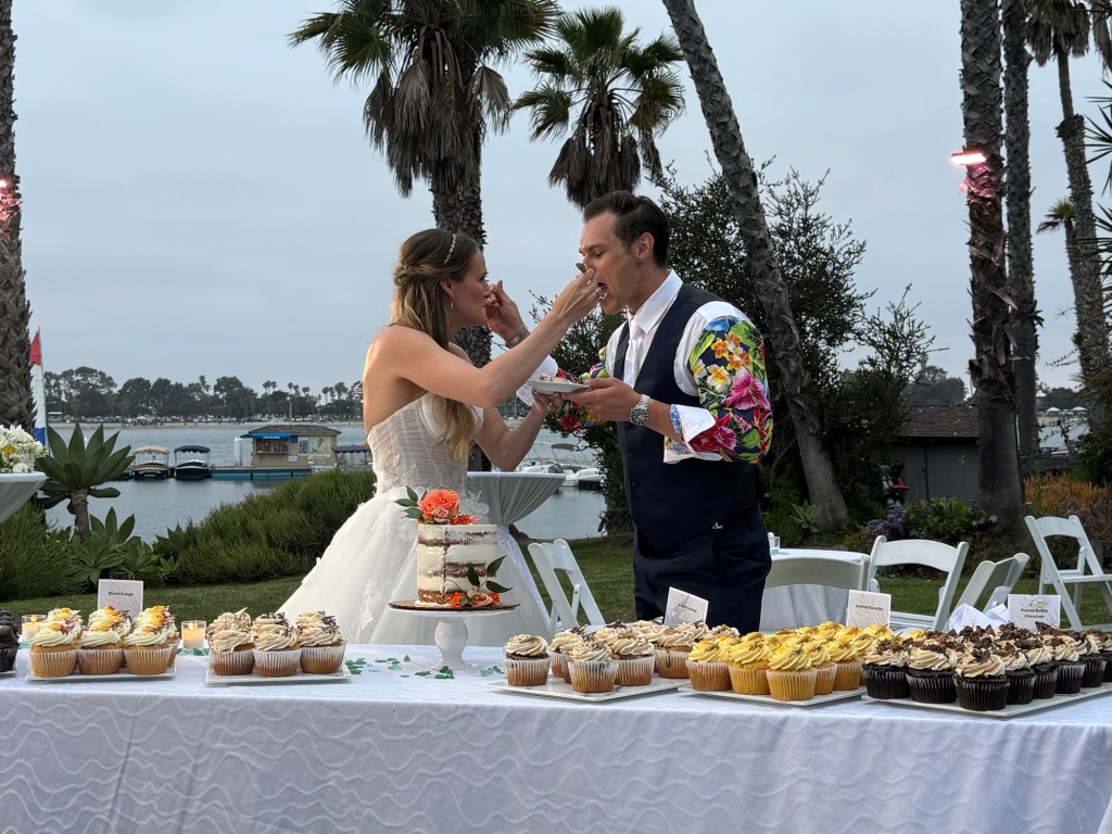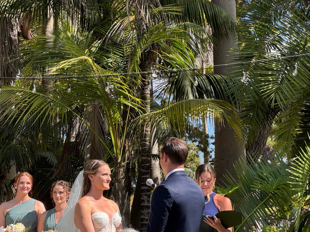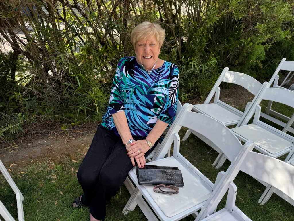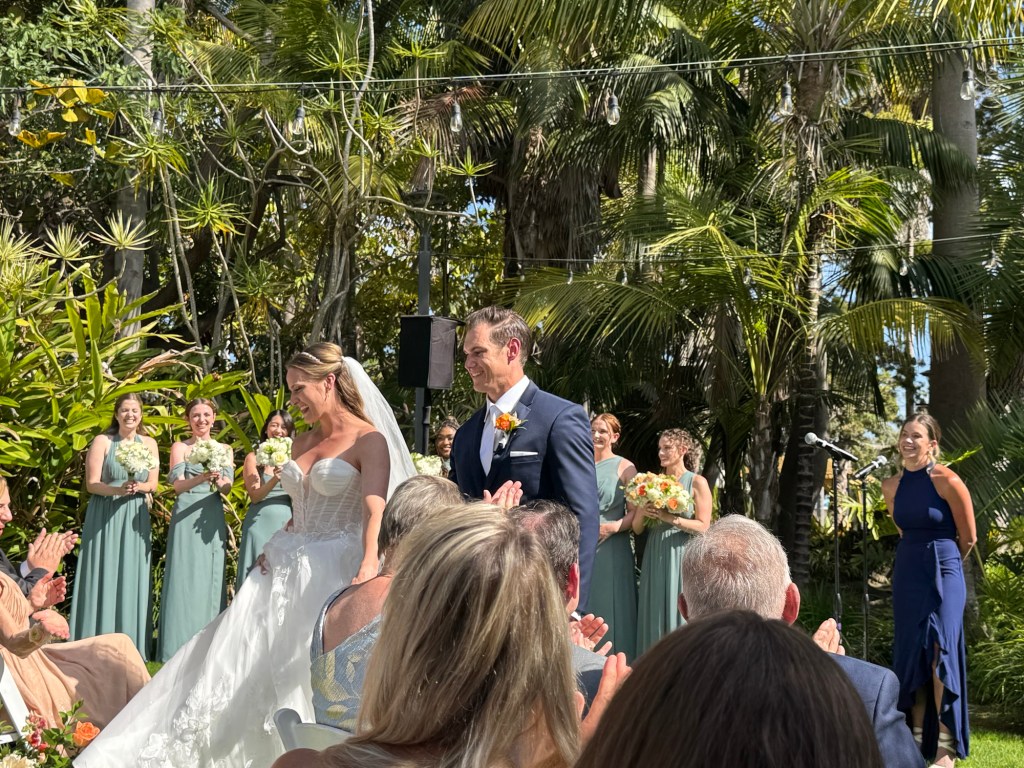 The reception/party was located on an outside terrace and the weather cooperated – sunshine, blue skies, not too warm except in the sun! The bride radiant, the groom handsome – a couple truly meant for each other.