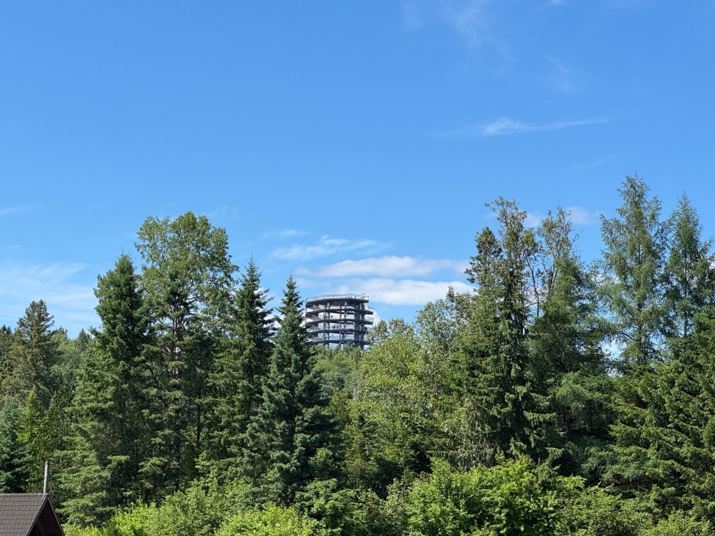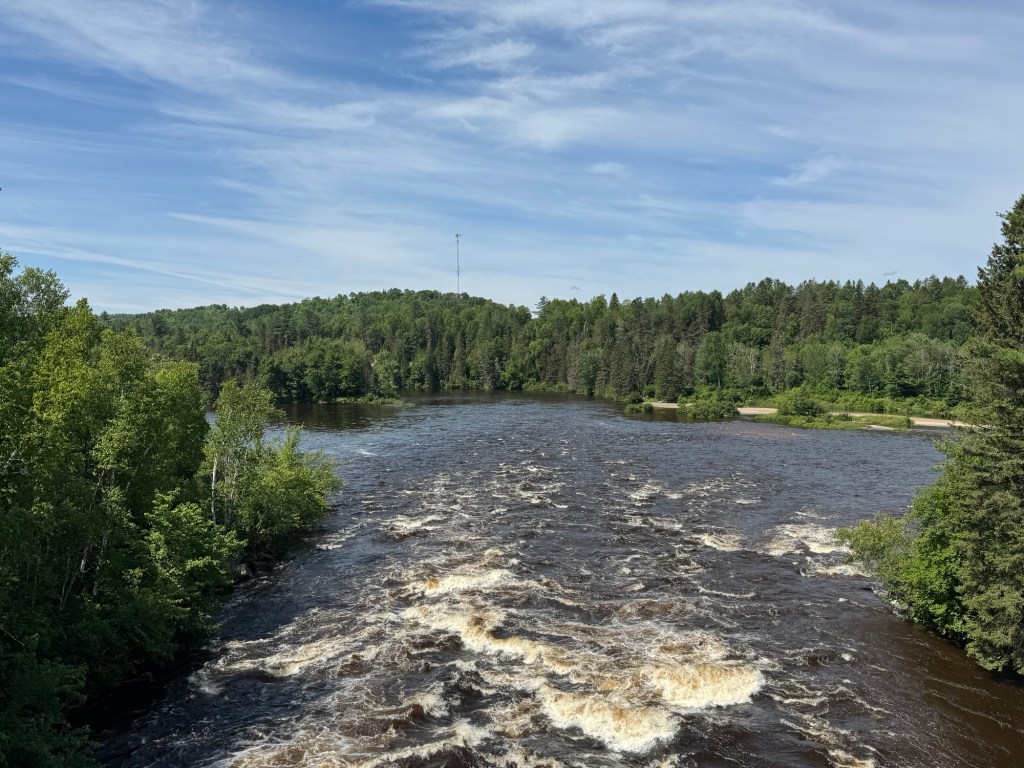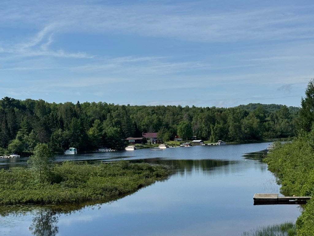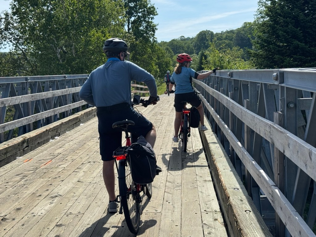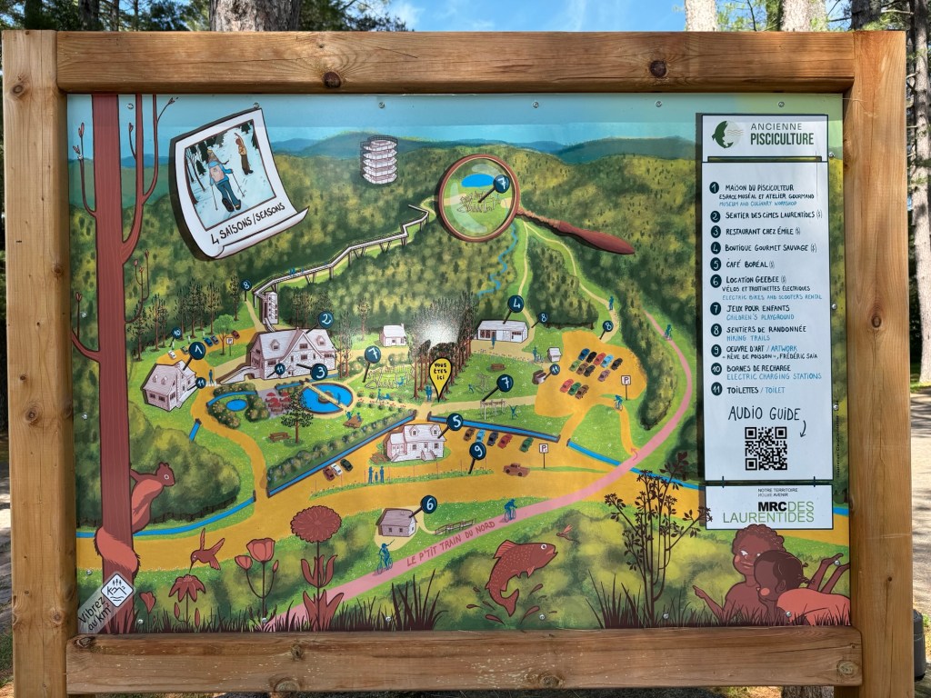 Our goal for the ride is from Lac Nominigue and end at the train station in Mont Tremblant. Others continue riding to the Treetop Walk – Sentier des crimes Laurentides, another 15 miles. Half of the group boards the van and Jim shuttles us to the area where the other riders will meet us.