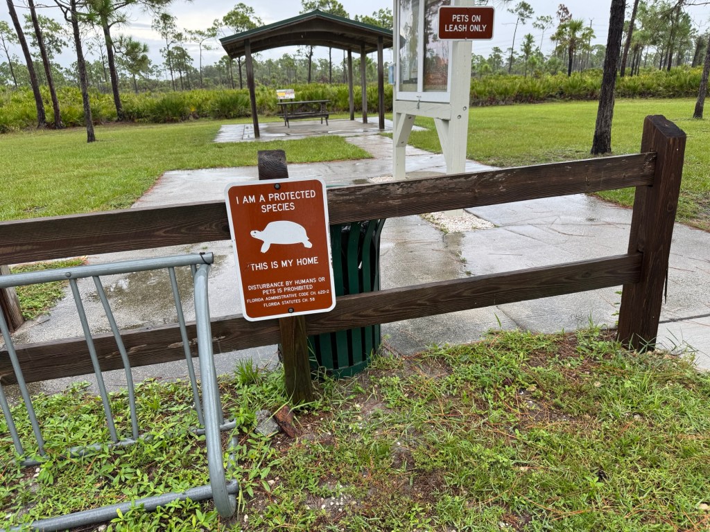 This park has four trails you can walk through the scrubland near the Estero River. Since it was raining, I just enjoyed the peace and quiet under a shelter looking at the scrubland. This area is also part of the Great Florida Birding Trail. No birds in sight today. Gopher turtle sign, no turtles.