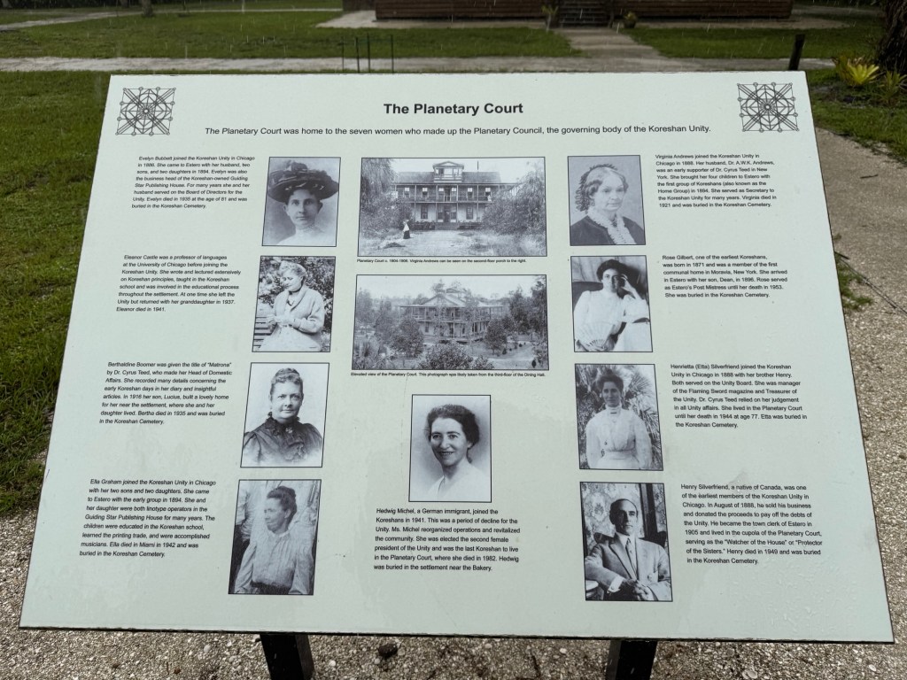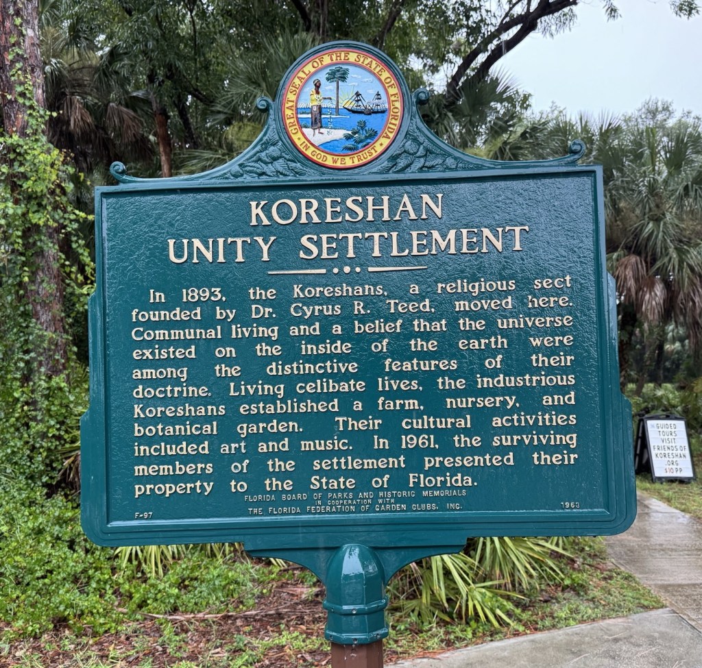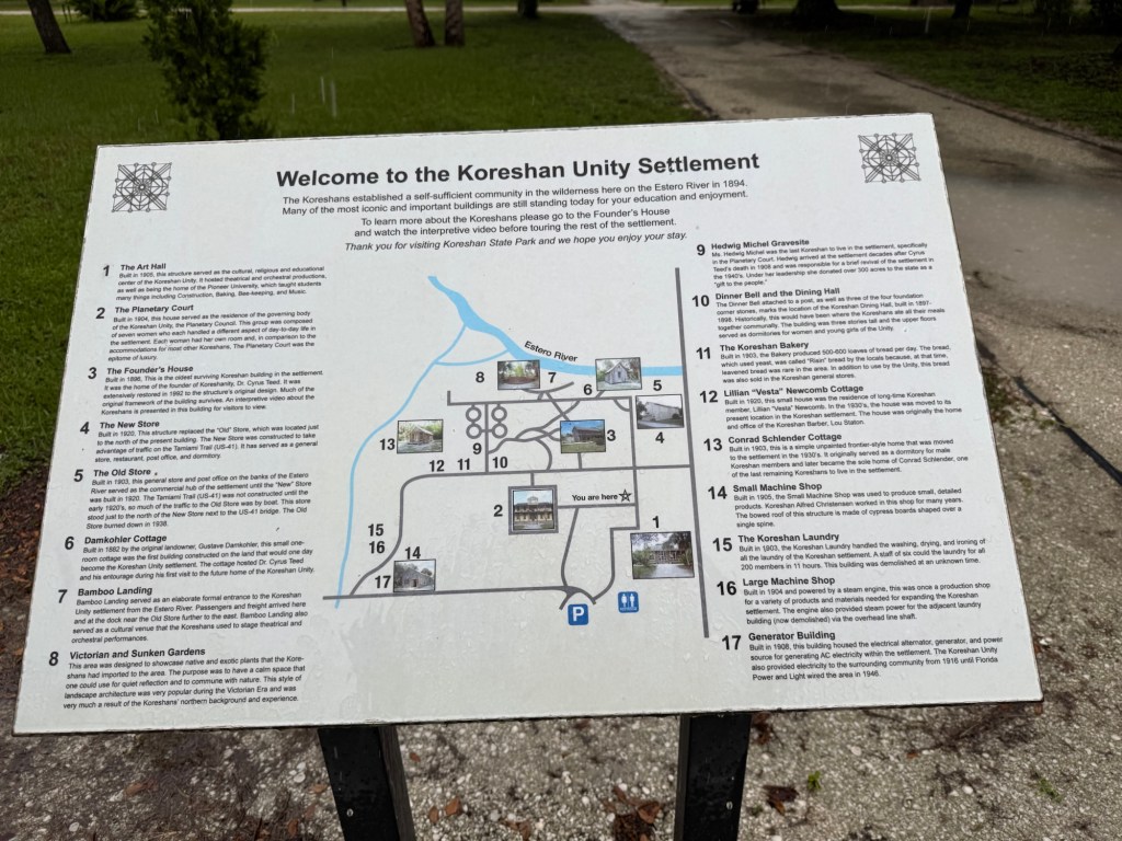 The land was donated by a religious sect known as the Koreshan. The sign summarizes what you need to know.