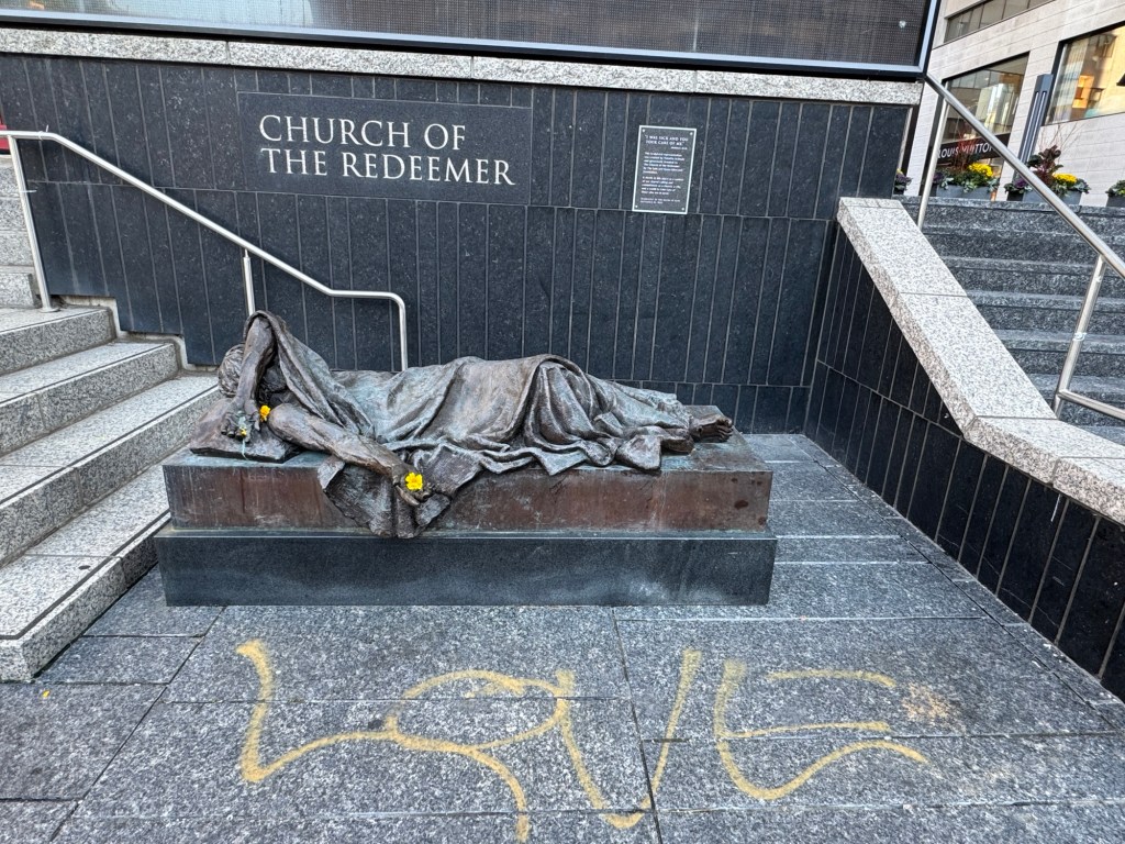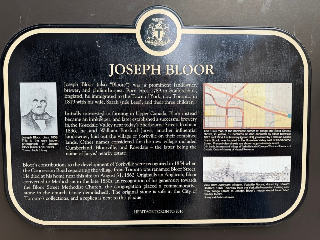 Further down Bloor Street is the modern skyline landscape with residential, offices, and stores. Of course there are homeless, only a few walking among the chic young strolling this Sunday morning. History plaques and building sculpted facades along the way.
