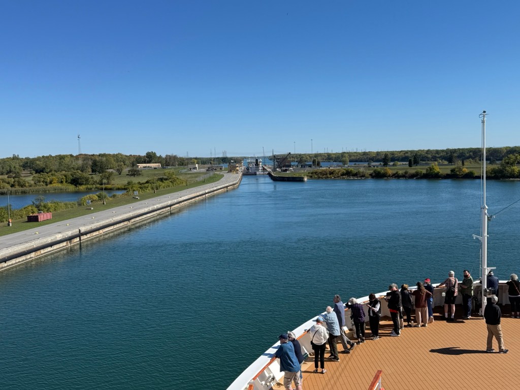 Quite a few people are up early this morning and waiting for the breakfast service to open at 7 AM, including me. The sun rises and shows the beautiful scenery along the shore of the St. Lawrence river – homes, industrial buildings, and forests, under a beautiful blue sky. Tinges of color can be seen on a few trees on either side. Large ships are heading the opposite direction, passing us as they head start to the Great Lakes. As we approach the first lock, people are waving to us on the Canadian side.