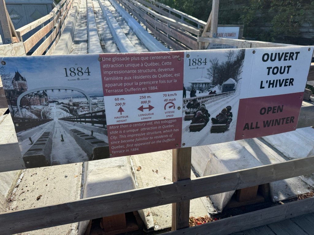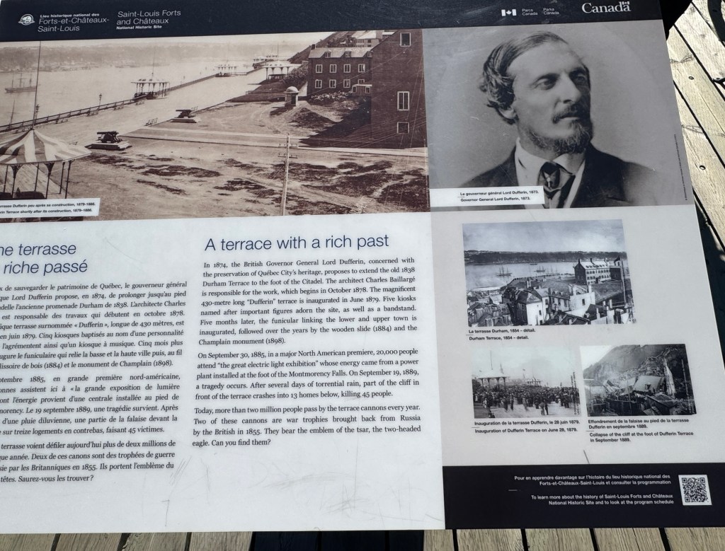 In front of the chateau is a beautiful terrace, a promenade or boardwalk where people enjoy the view of the river and just sitting or strolling. Directly under the terrace is an archeological historic museum with remains of Saint Louis Forts and Chateau. Tours are available. At one end is a toboggan slide built in 1884 and still usable in the winter.