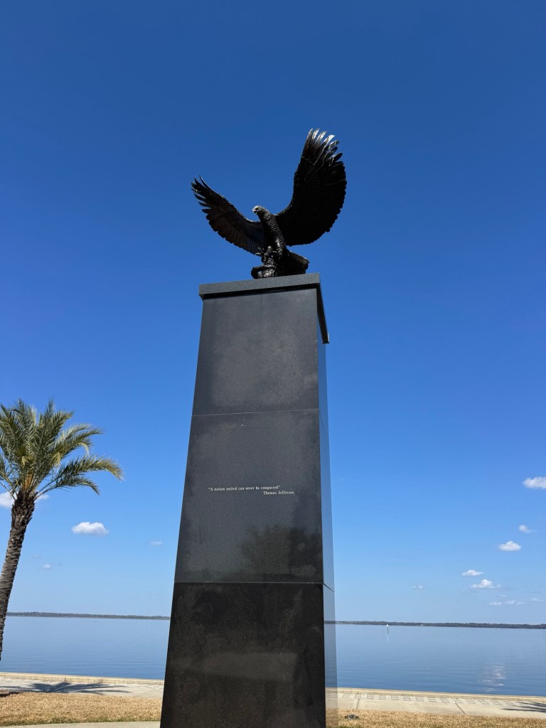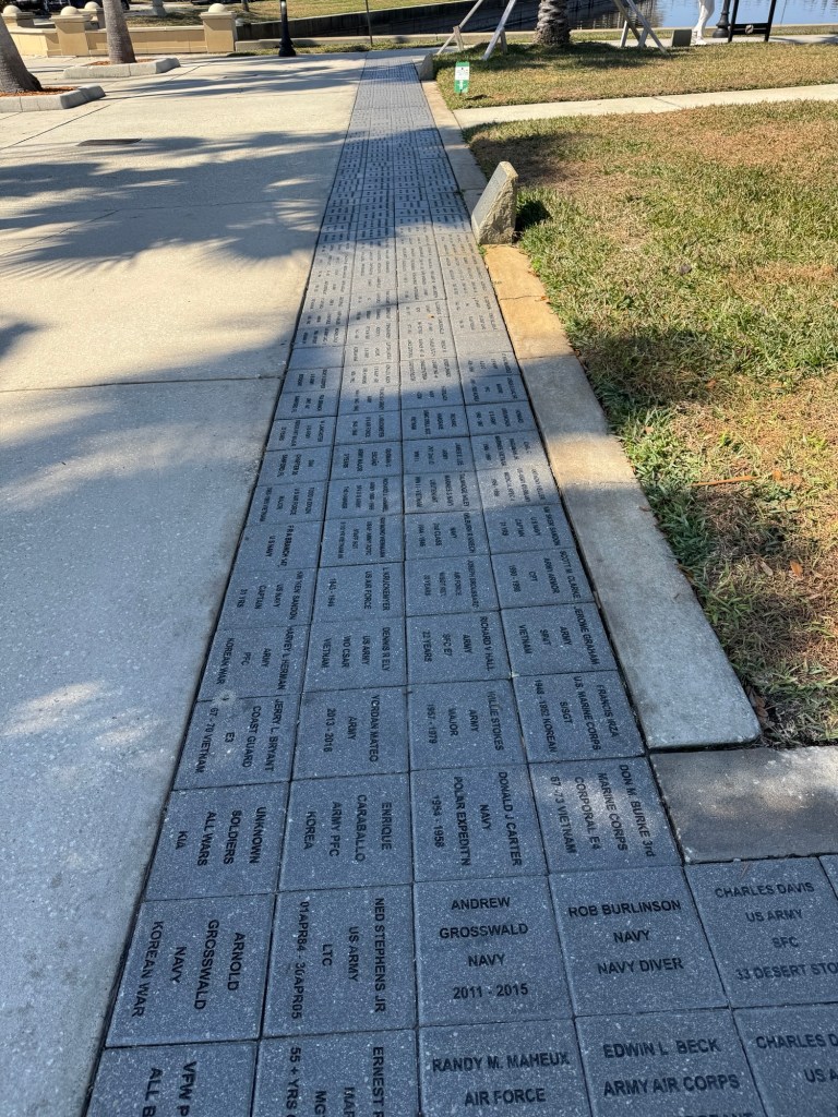 After walking main street, we strolled down to Lake Monroe where there is a marina and Veterans memorial. A paved trail runs along Lake Monroe, called the Riverwalk; people are enjoying walking and riding bicycles. Very pretty place to visit.